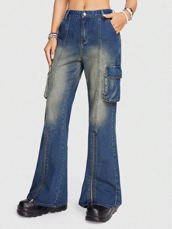 Grunge Punk بنطلون جينز متسع للساق للسيدات بتصميم كارجو وجيوب جانبية