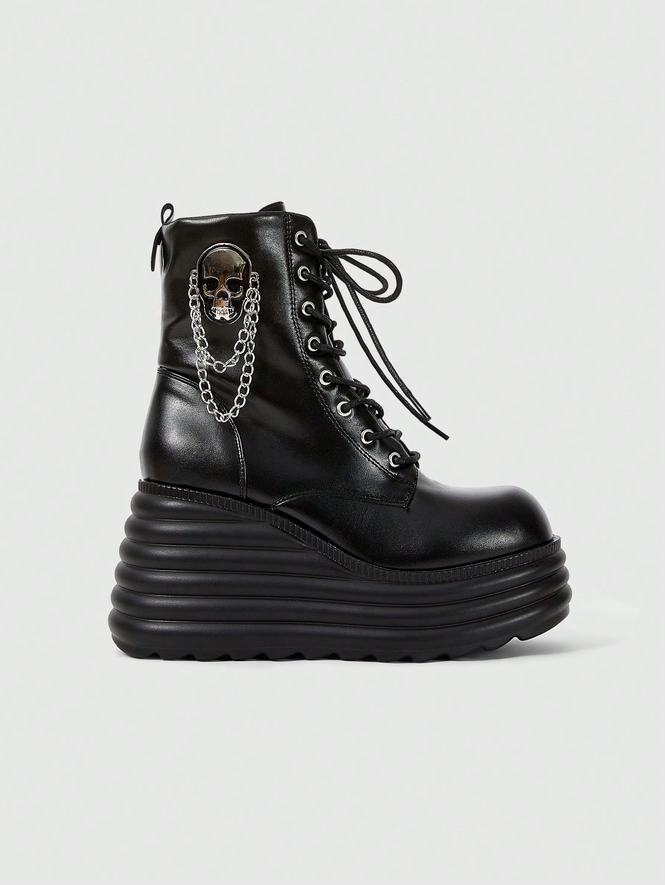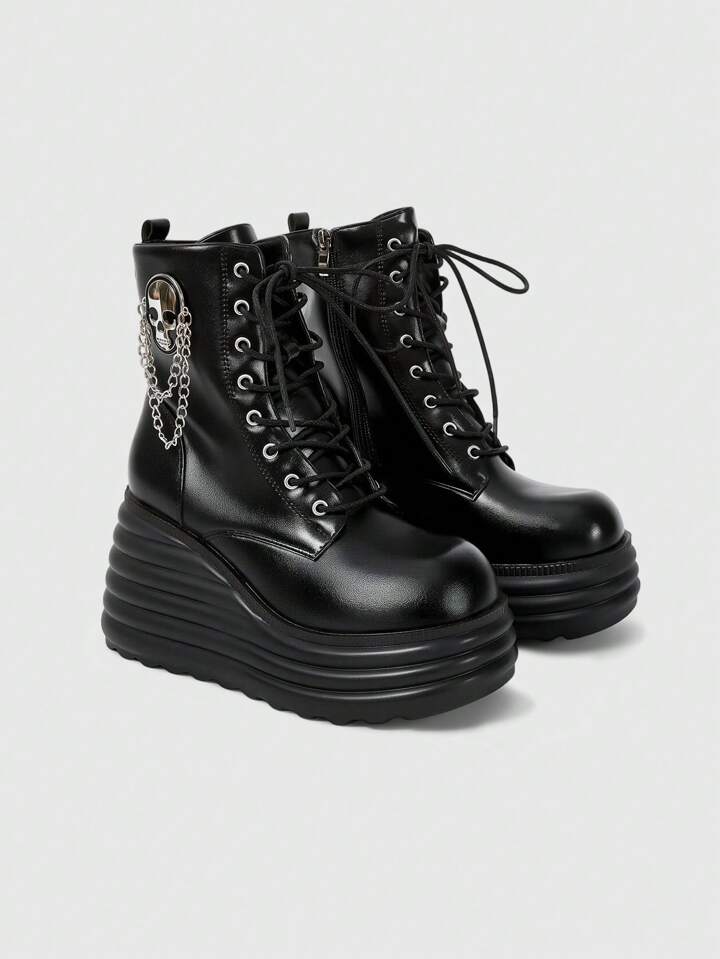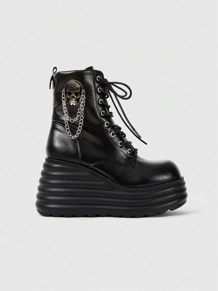 Grunge Punk بوت بوت قصير من الجلد الصناعي بنعل سميك وتصميم معدني تحت العقب على شكل جمجمة، مناسب للارتداء اليومي، في الحرم الجامعي، أو للأزياء البانك