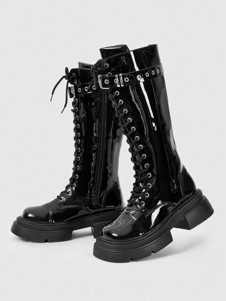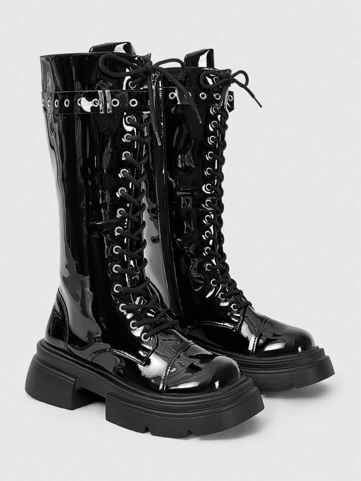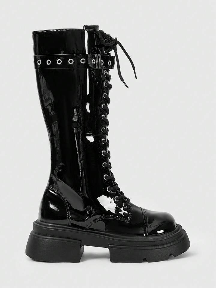 Grunge Punk بوت نسائية من منتصف الساق بكعب عالي وسميك من الجلد المدبوغ بطراز بانك جوثيك، للهالوين
