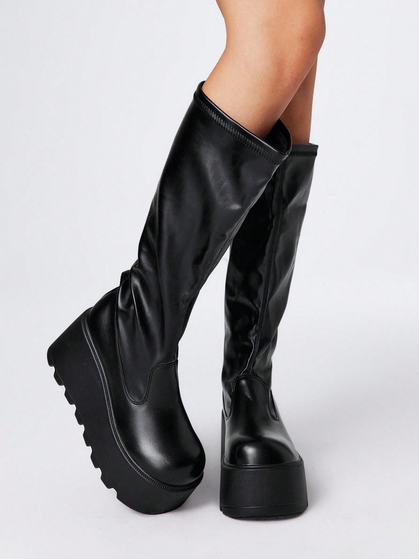 Grunge Punk بوت ركوب منتصف الساق بنعل منصة مرن ذات أصبع مستدير للنساء، موضة خارجية من الجلد سهلة الارتداء، موديل 2025 الجديد
