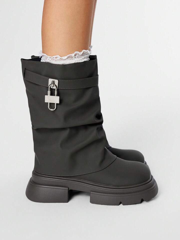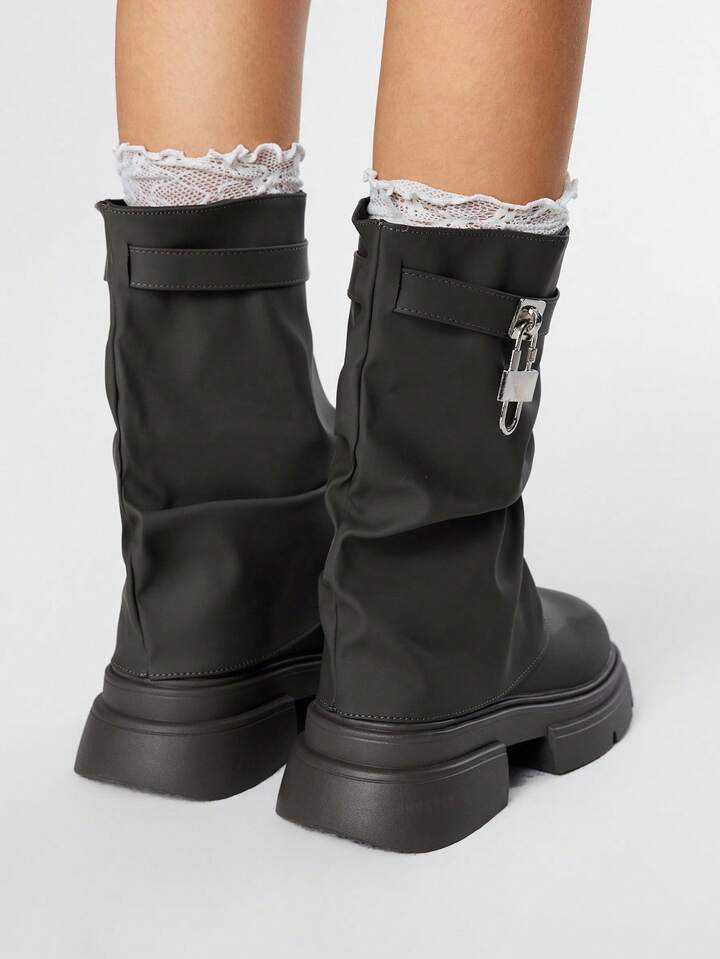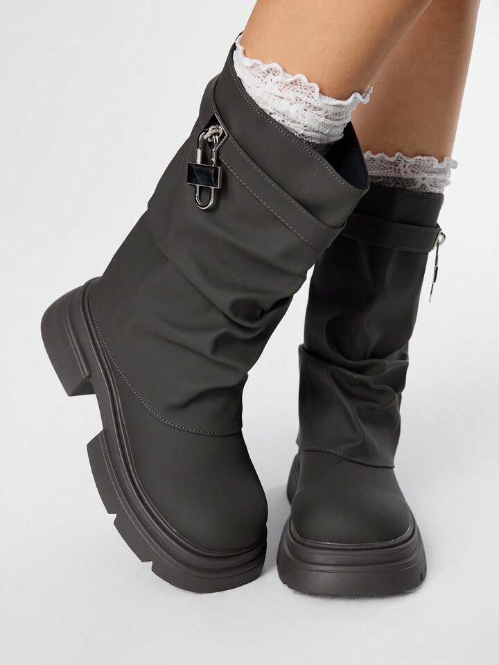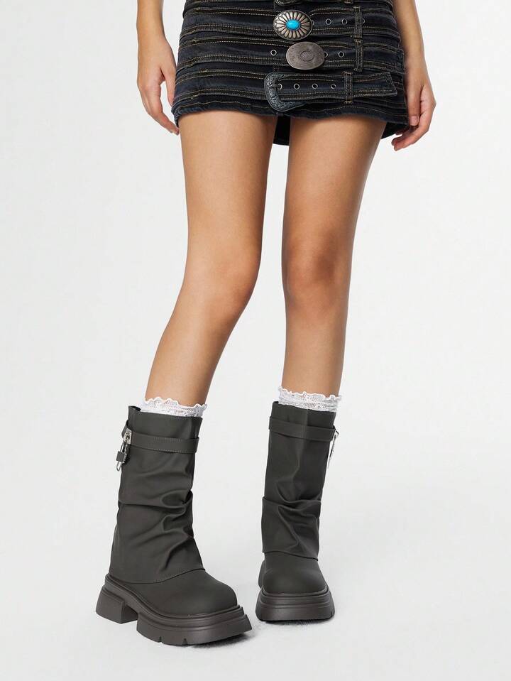 Grunge Punk بوت دراجات نارية للنساء ذات إبزيم أسود، بوت طويلة جلدية منخفضة الكعب، بوت ذات أصابع مستديرة وساق متوسطة الطول، بوت كاجوال للشارع والكمبوس بطراز بانك