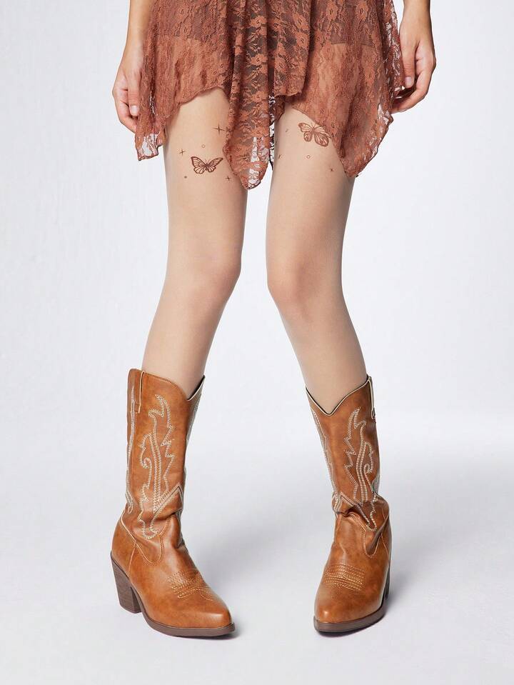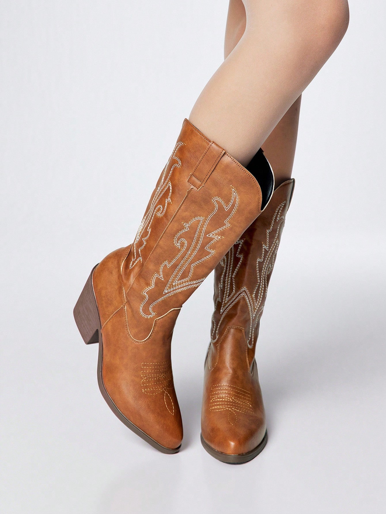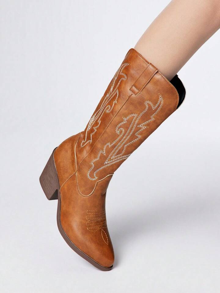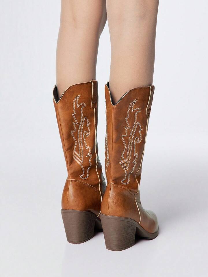Grunge Punk بوت كاوبوي بني للنساء، بكعب سميك وأصبع مدبب مطرز بطراز غربي، بوت ركوب غربية من الجلد للخارج والموضة