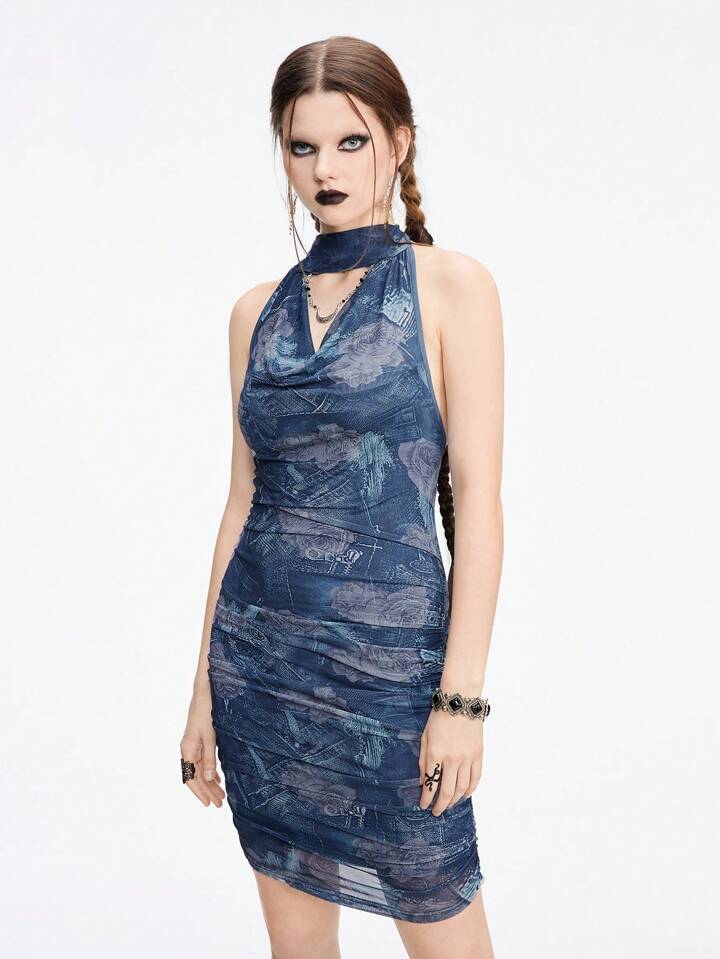 Grunge Punk فستان شبكي نسائي ذو طابع مستقبلي موشح بطبعات مليئة بعناصر الورد