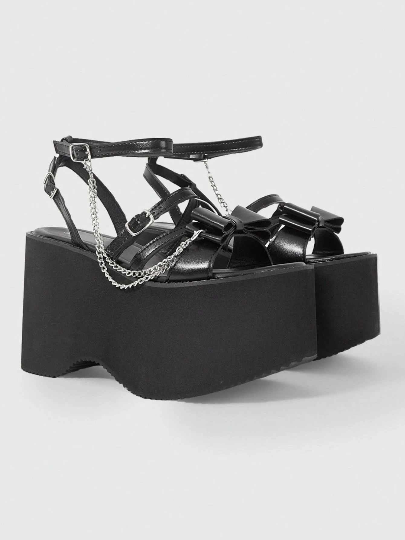 Grunge Punk صنادل بكعب عالي وسميك بتصميم منمق مع فيونكة أنثوية ،أحذية مفتوحة الأصبع بأشرطة معدنية شبه بطراز بانك Y2K مريحة للنساء