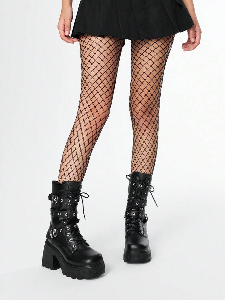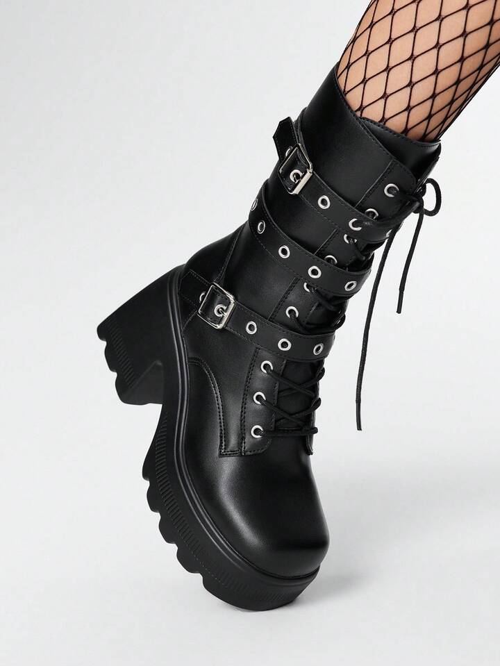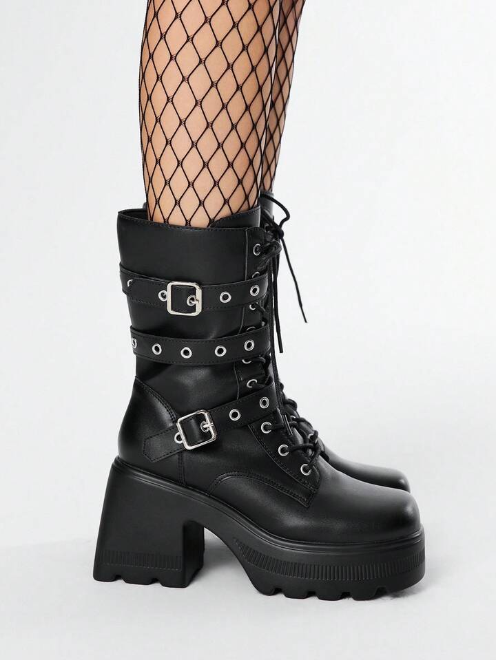 Grunge Punk بوت نسائية ذات كعب عالي وأصبع مربع، مزينة بأربطة وإبزيم على الطراز البانك، من جلد علوي، وسحاب جانبي حتى منتصف الساق، موديل جديد للربيع/الخريف للاستخدام الخارجي