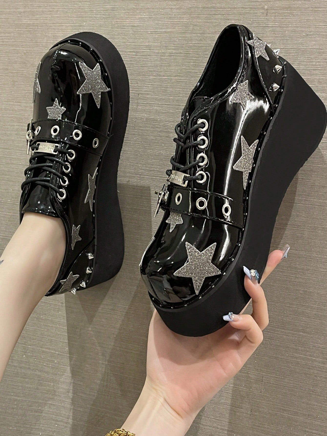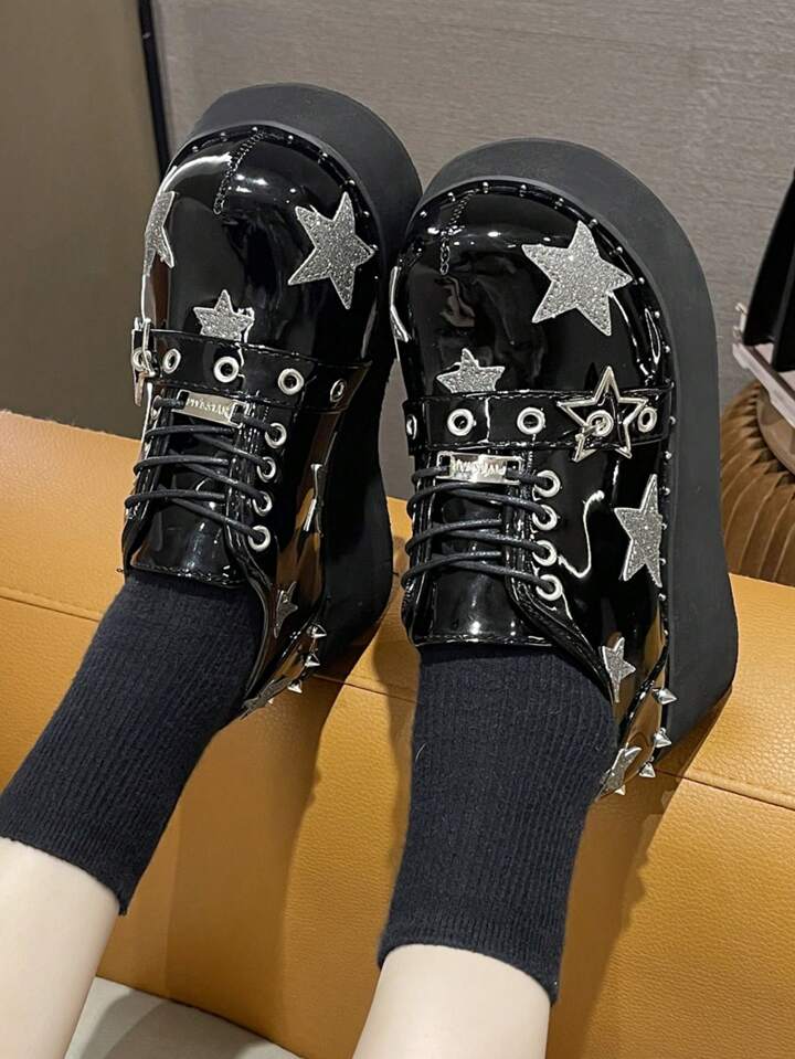 Grunge Punk حذاء نسائي بإكسسوارات نجمية عالي الكعب والمنصة