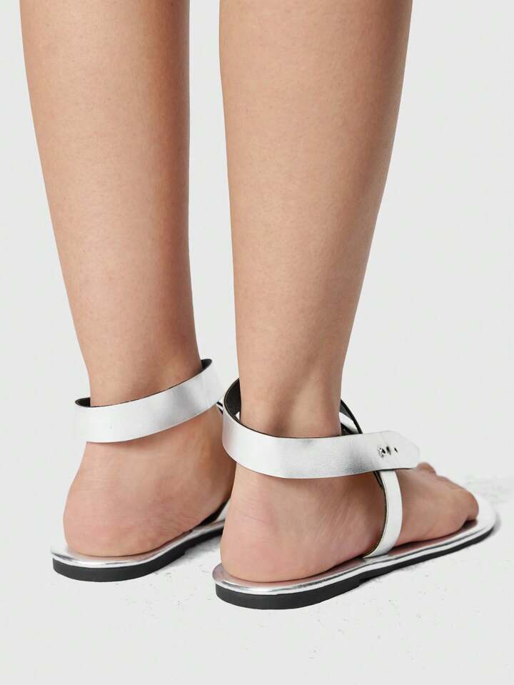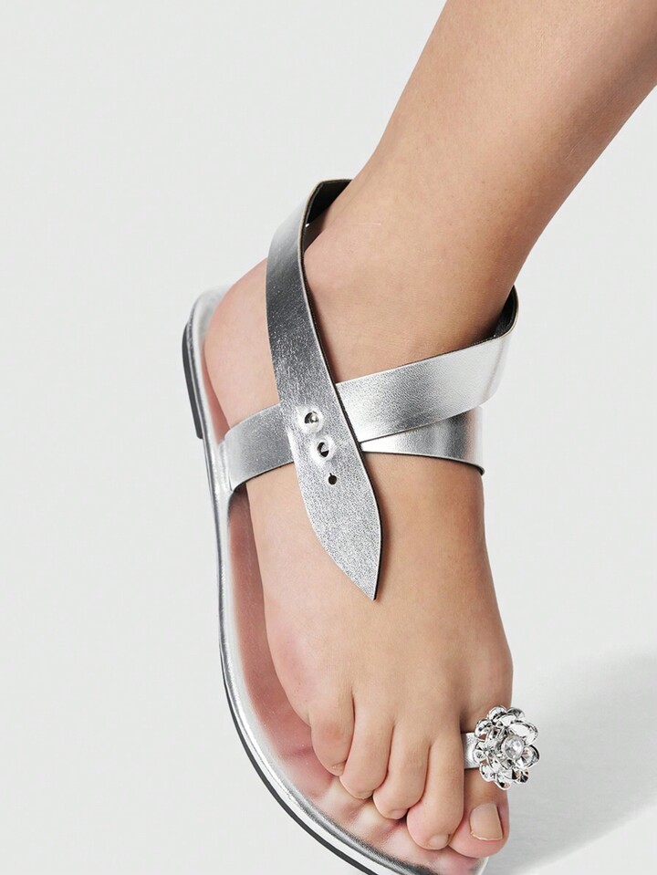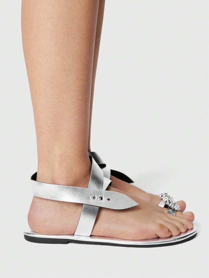 Grunge Punk صنادل صيفية للنساء مفتوحة الأصابع بتصميم صليبي على الكاحل، وبنعل ناعم لامع باللون الفضي مزخرف بالراين ستون سهل الارتداء، صنادل مسطحة للشاطئ والعطلات مناسبة للاستخدام اليومي