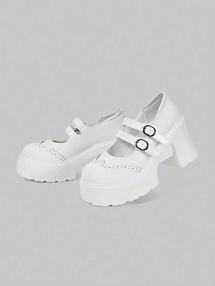 Grunge Punk أحذية ماري جين للنساء ذات الكعب السميك والنعل السميك، أبيض، أنف مستدير، منصة عالية، حزام واحد، كعب مرتفع، موديل جديد لربيع وصيف 2025