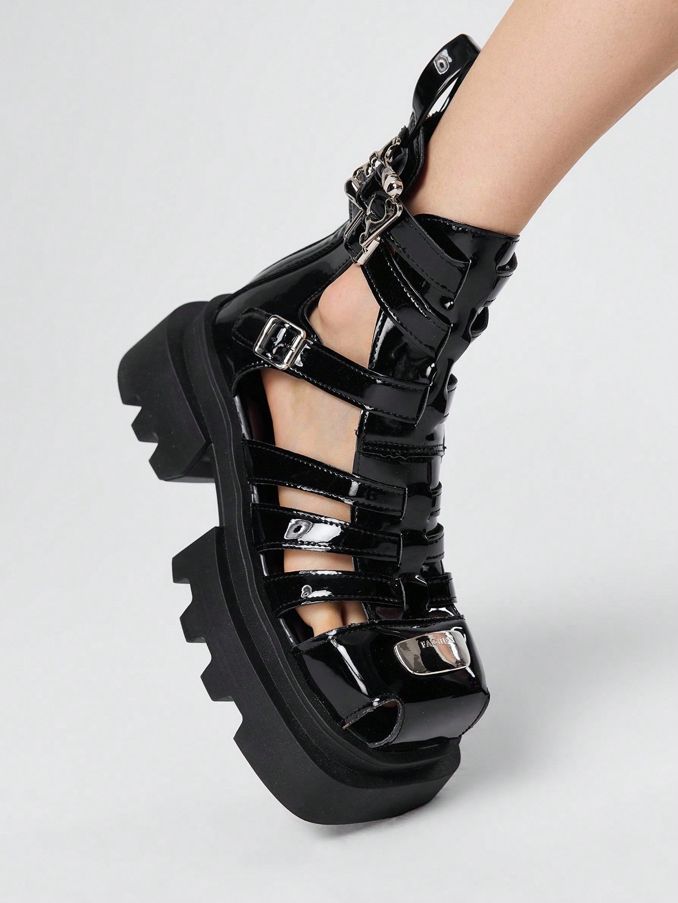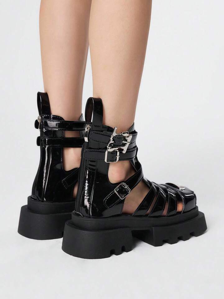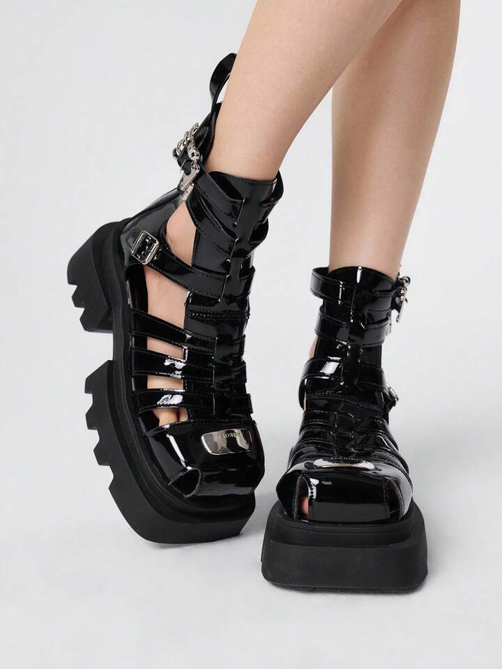 Grunge Punk بوت نسائية مصنوعة بنسيج أسلوب روماني مفرغة ذات منصة، بوت ذات أسطح سميكة ذات أصابع مربعة قصيرة، موديل صيف 2025 جديد الوصول