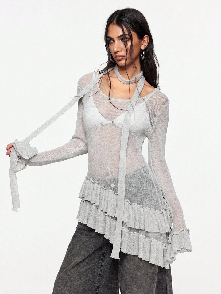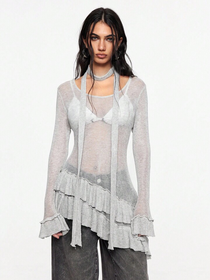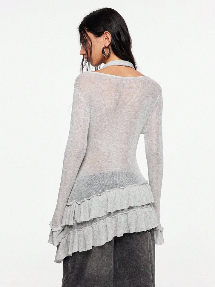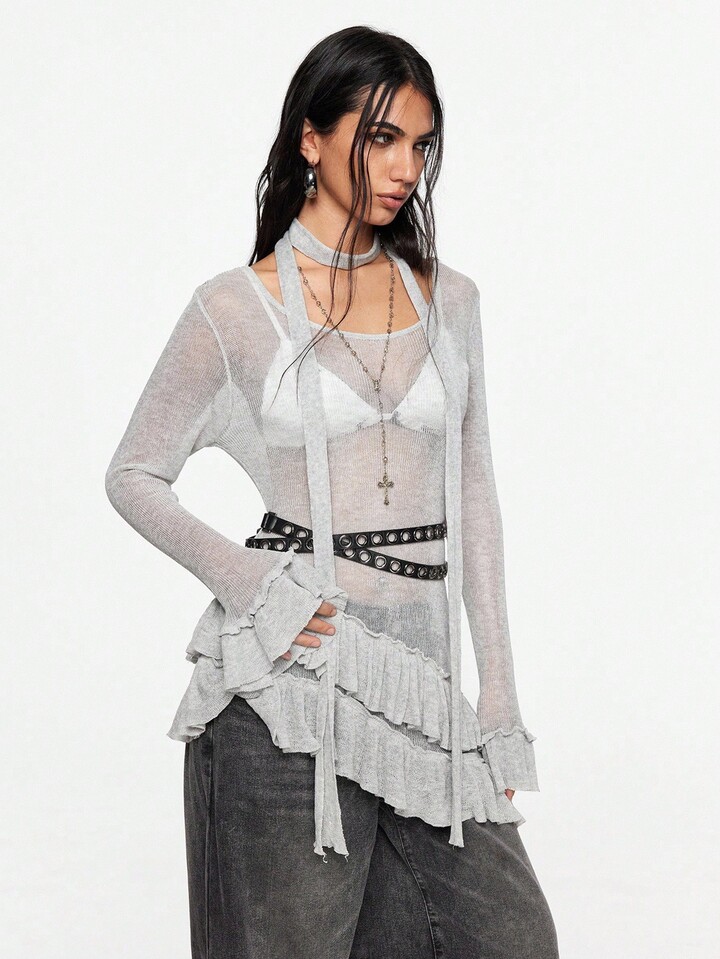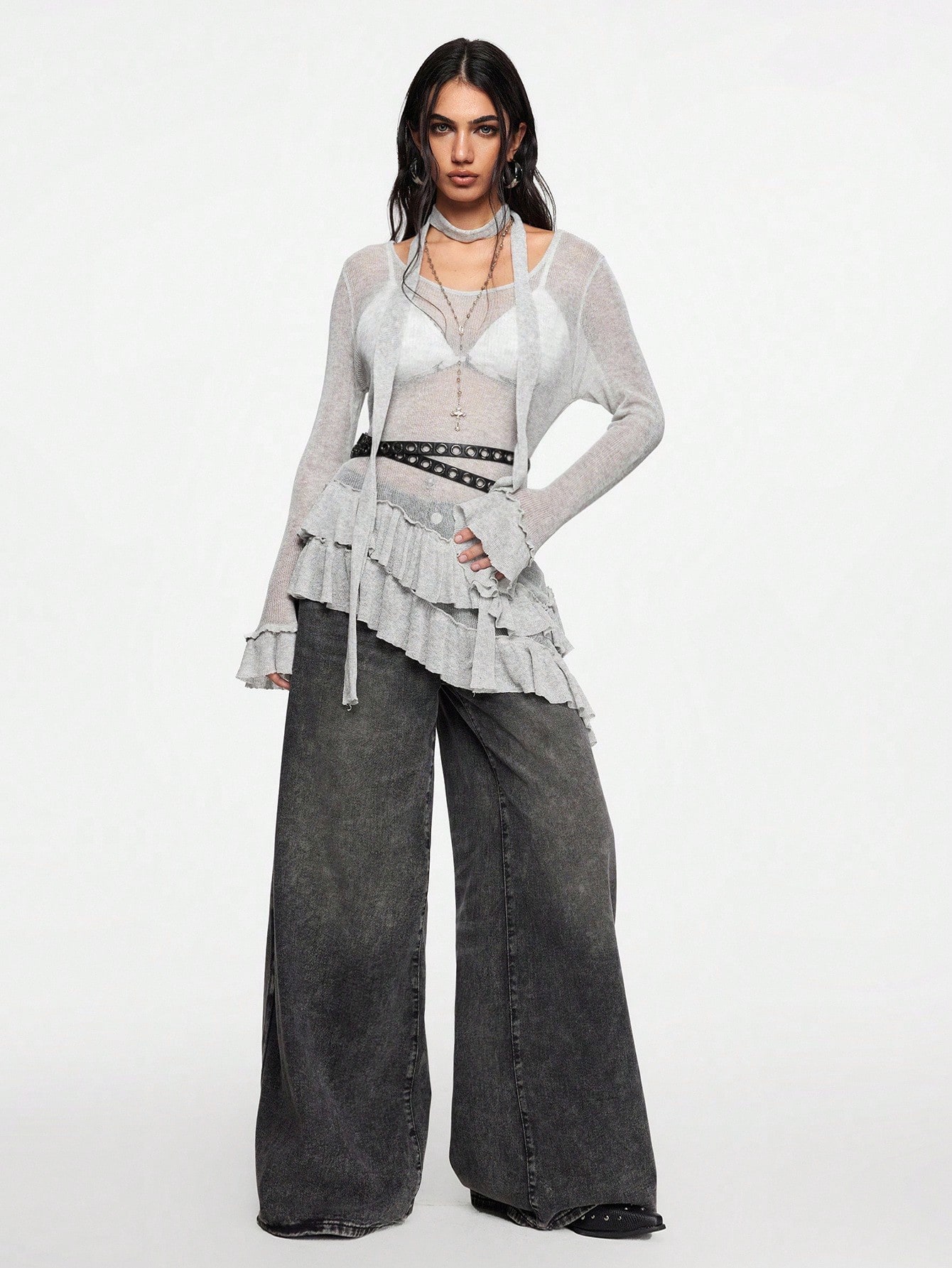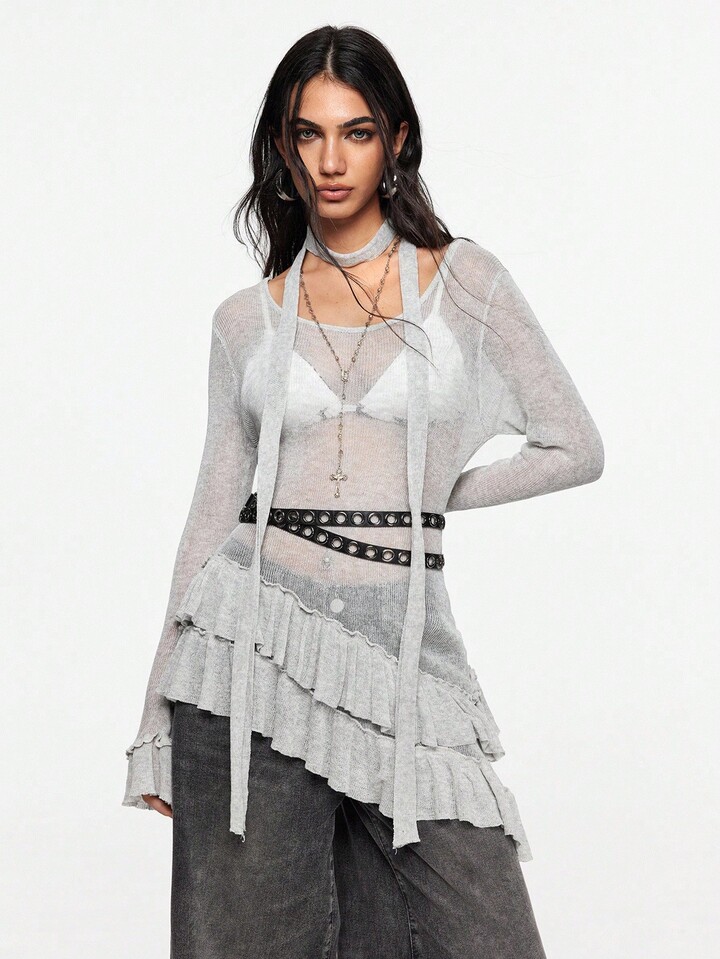 Grunge Punk ملابس علوية محبوكة بياقة عالية وأكمام طويلة مع تصميم غير متماثل وحاشية مزدوجة من الكشكشة