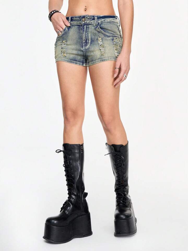 Grunge Punk شورت جينز مشوه محروق بنمط بانك للنساء
