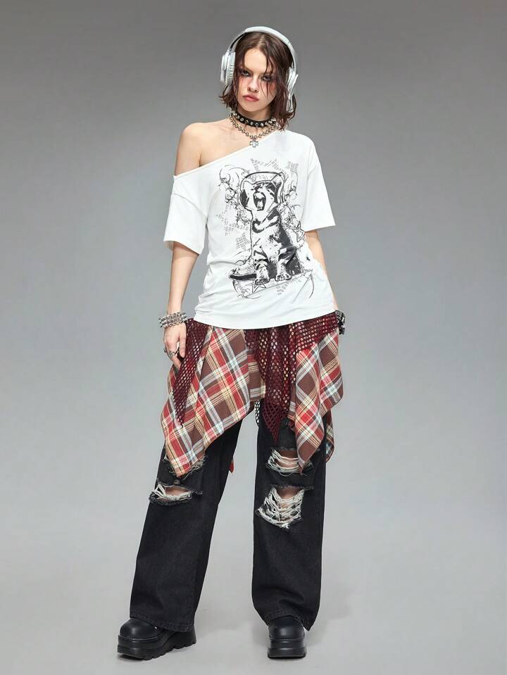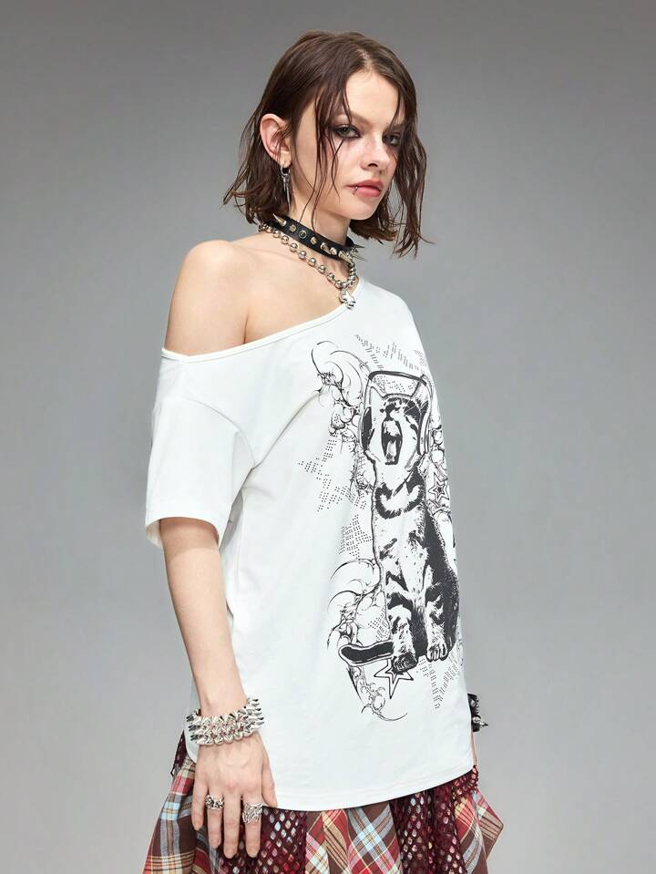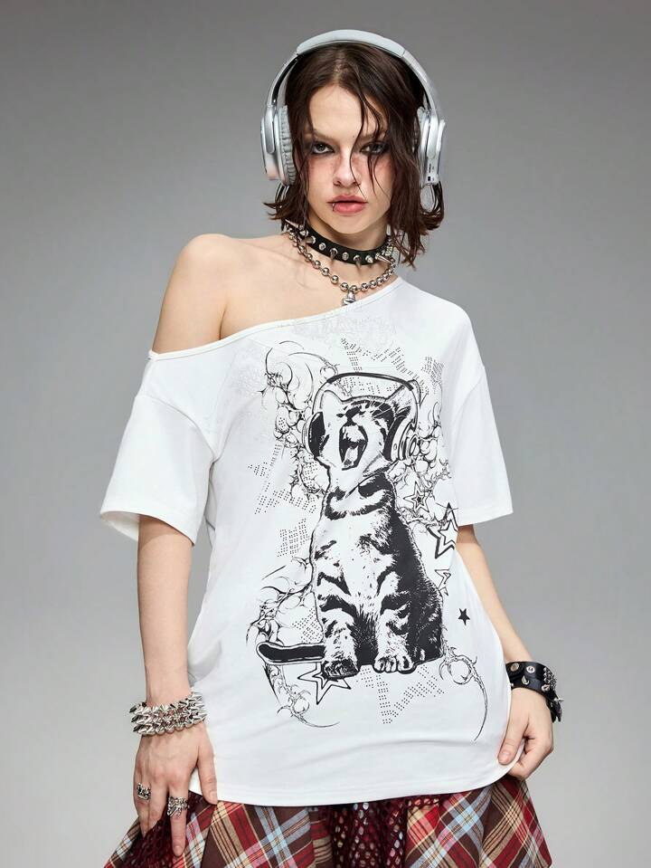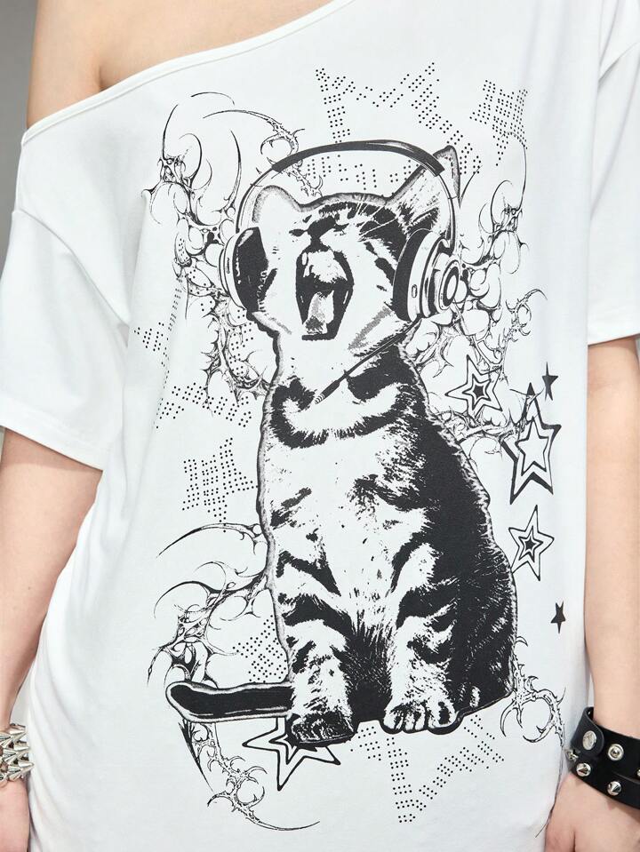 Grunge Punk ملابس علوية قصير الأكمام بأكمام سترة ، طباعة قطة على الطراز البانك الفرعي, في أسلوب الغرنج والطراز الرجعي