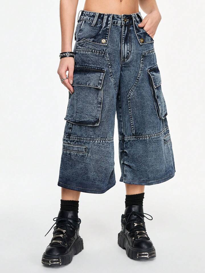 Grunge Punk بنطال جينز مشغول Y2K للنساء، منخفض الخصر، واسع، مرقع ومبهت اللون مع جيوب كارجو قصير