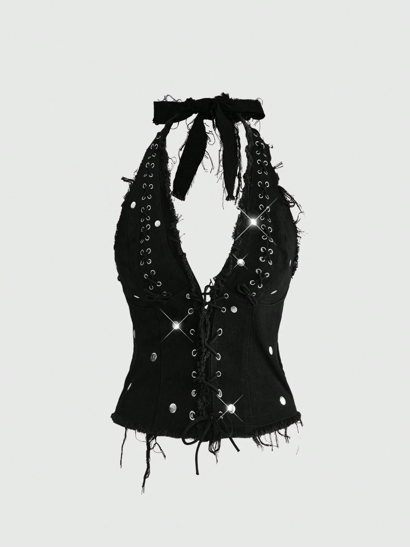 Grunge Punk توب كروب جينز ضيق مزين بالنيتات والحلقات المعدنية بطراز بانك وعنق حلقي بطراز Y2K الرجعي الجذاب
