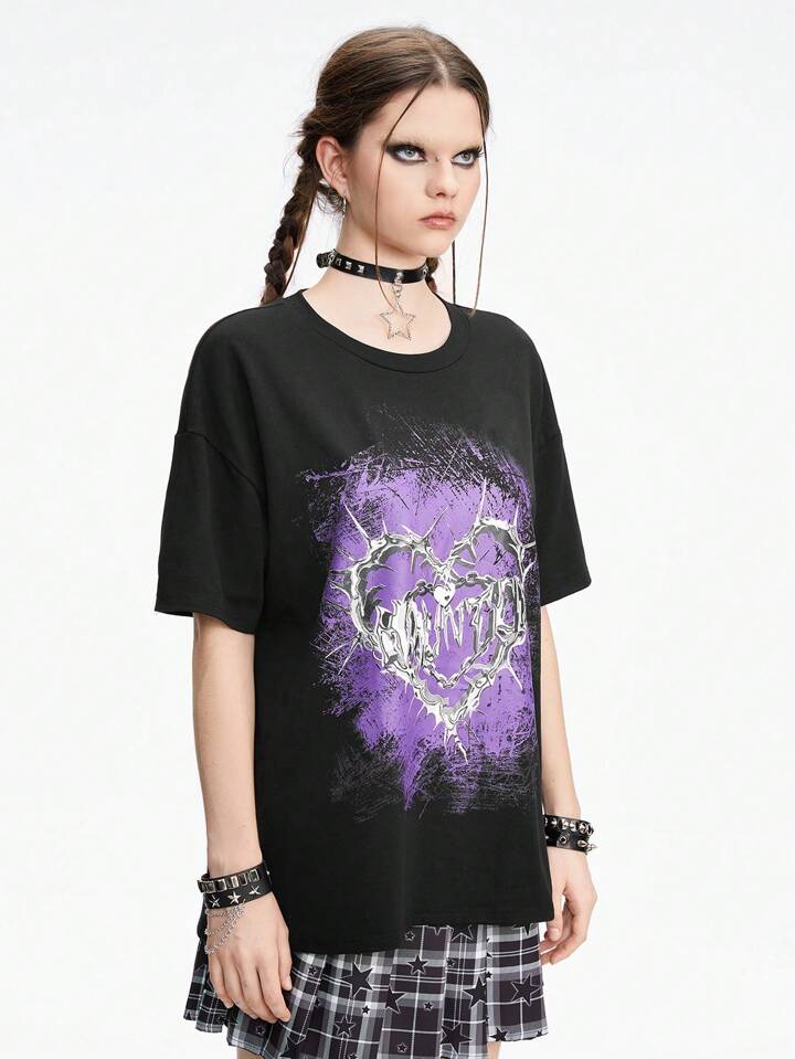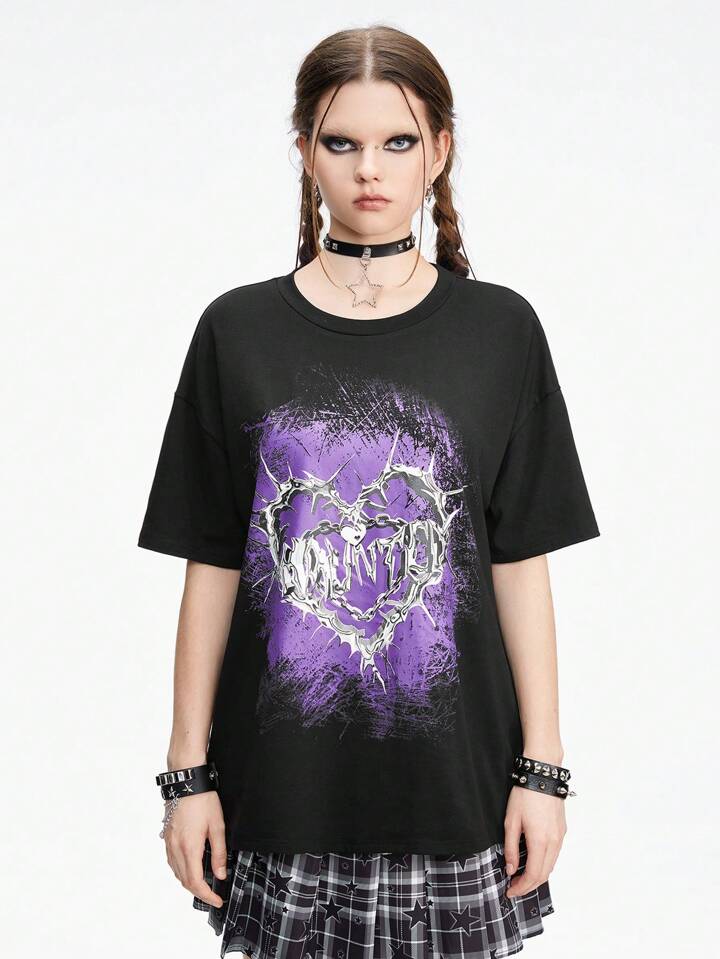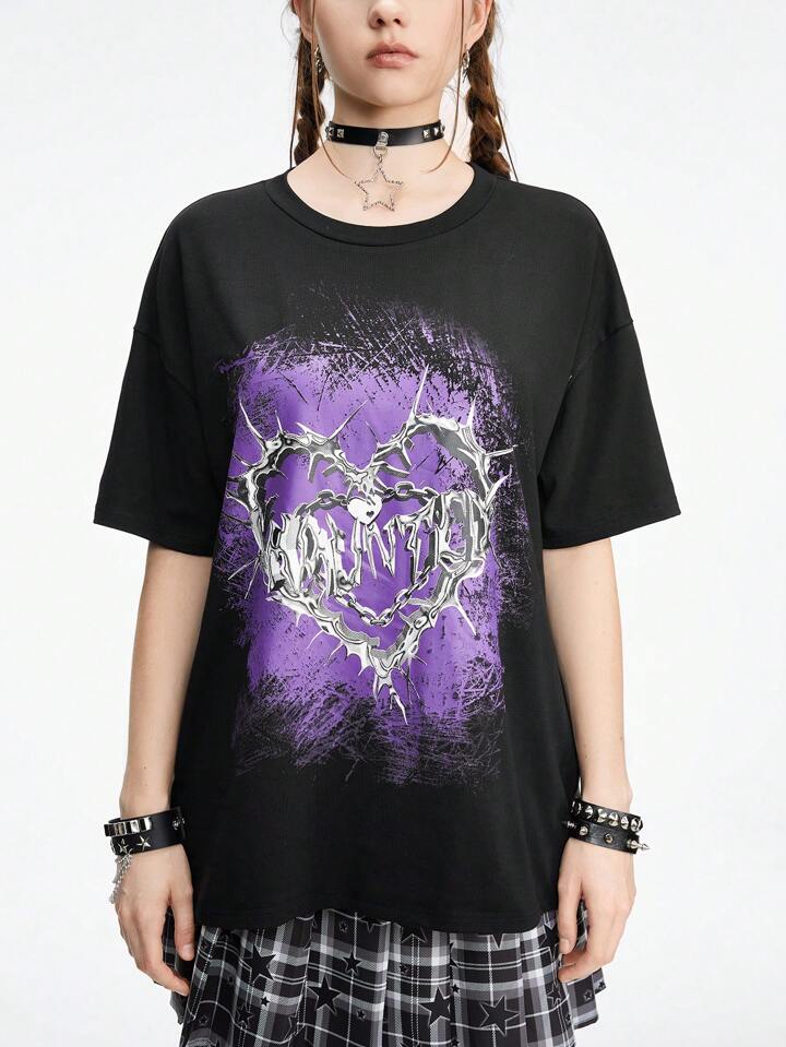 Grunge Punk تي شيرت نسائي فضفاض ذو قلب ملتوي وأشواك لمهرجان موسيقى البنك المعدني والميتال