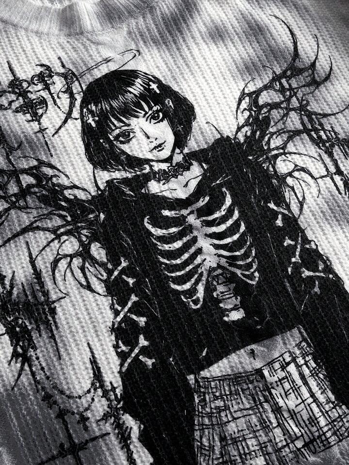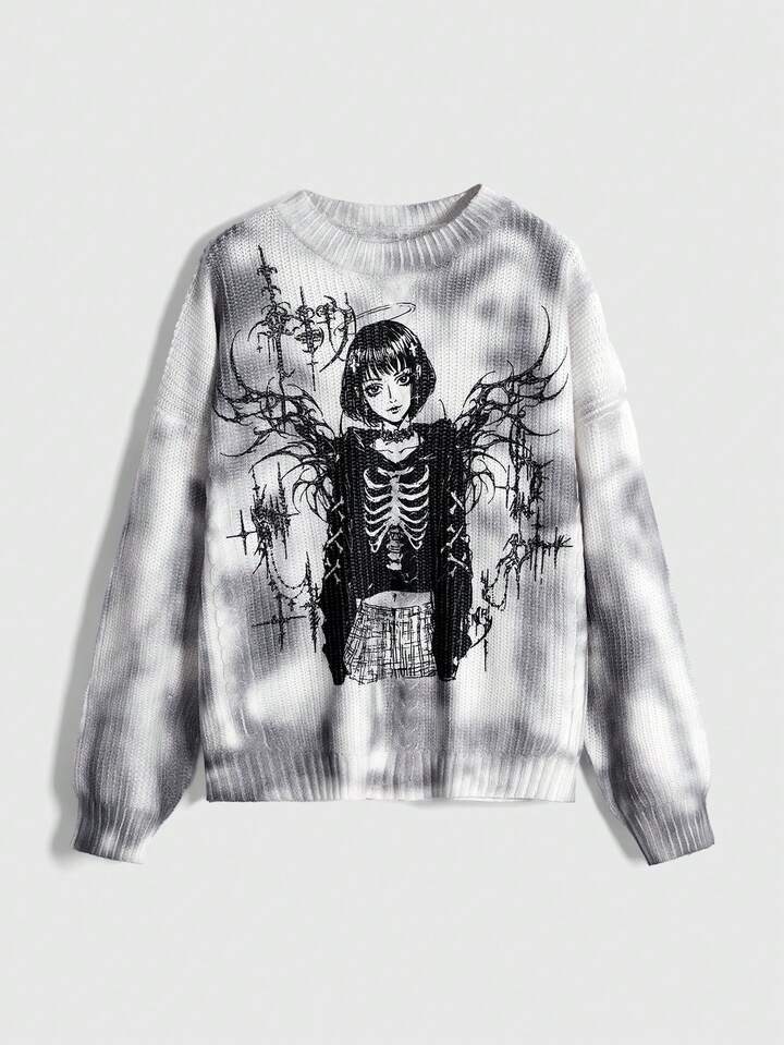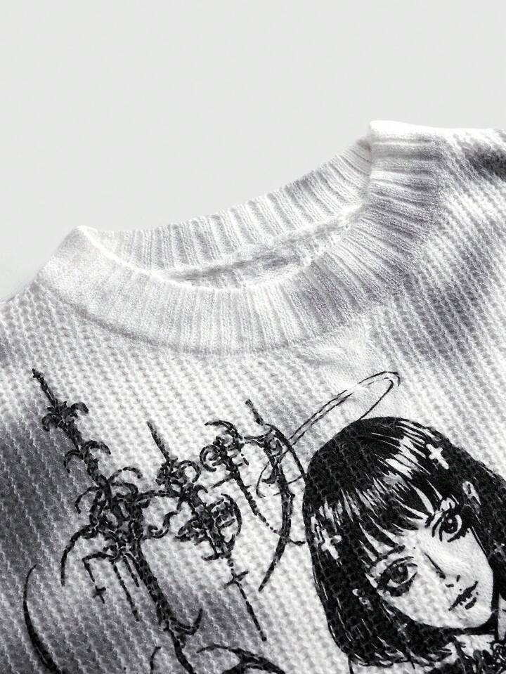 Grunge Punk كنزة صوفية نسائية فضفاضة مطبوعة برمز Y3k السيبراني وشخصيات الأنمي بغسيل متهالك