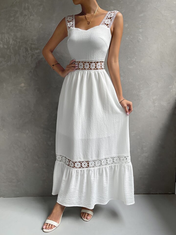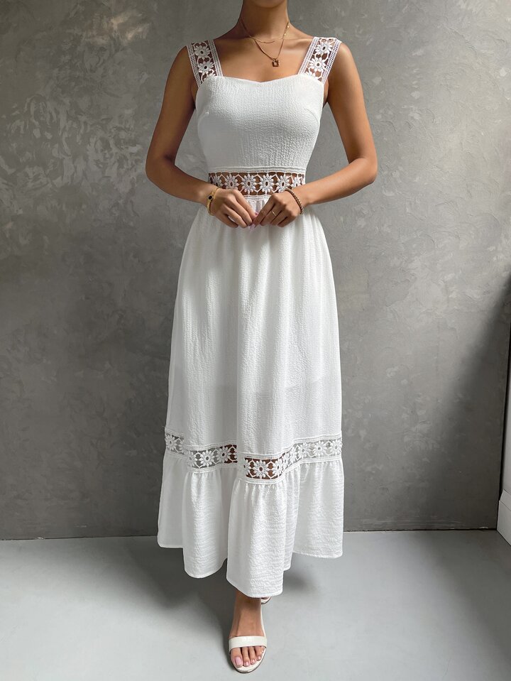 فستان ماكسي بإضافة دانتيل جيبور وكشكشة على الأطراف للنساء، ملابس شاطئ وإجازة