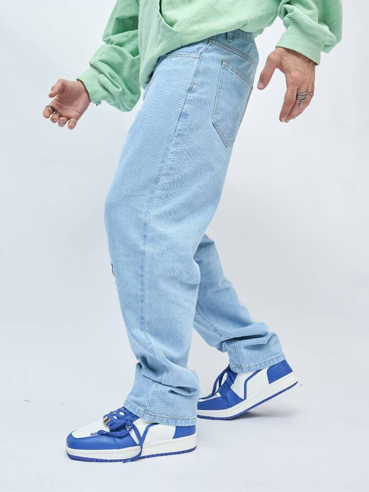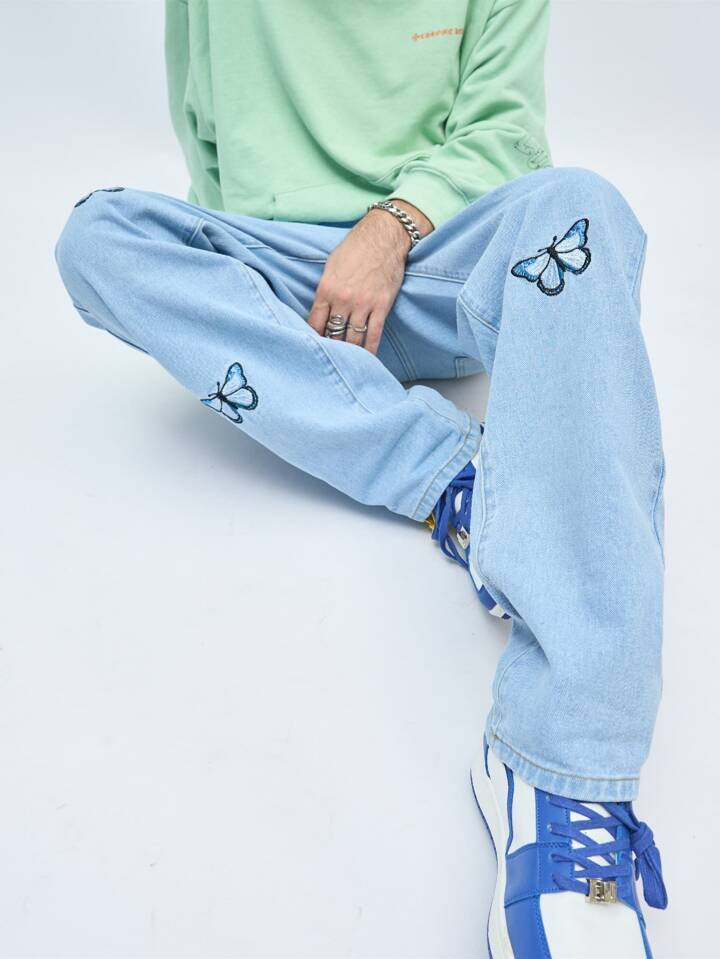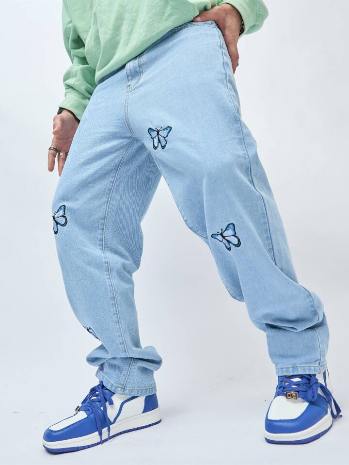 جينز رجالي فضفاض صمم بتطريز فراشة وقصة ساق مستقيمة