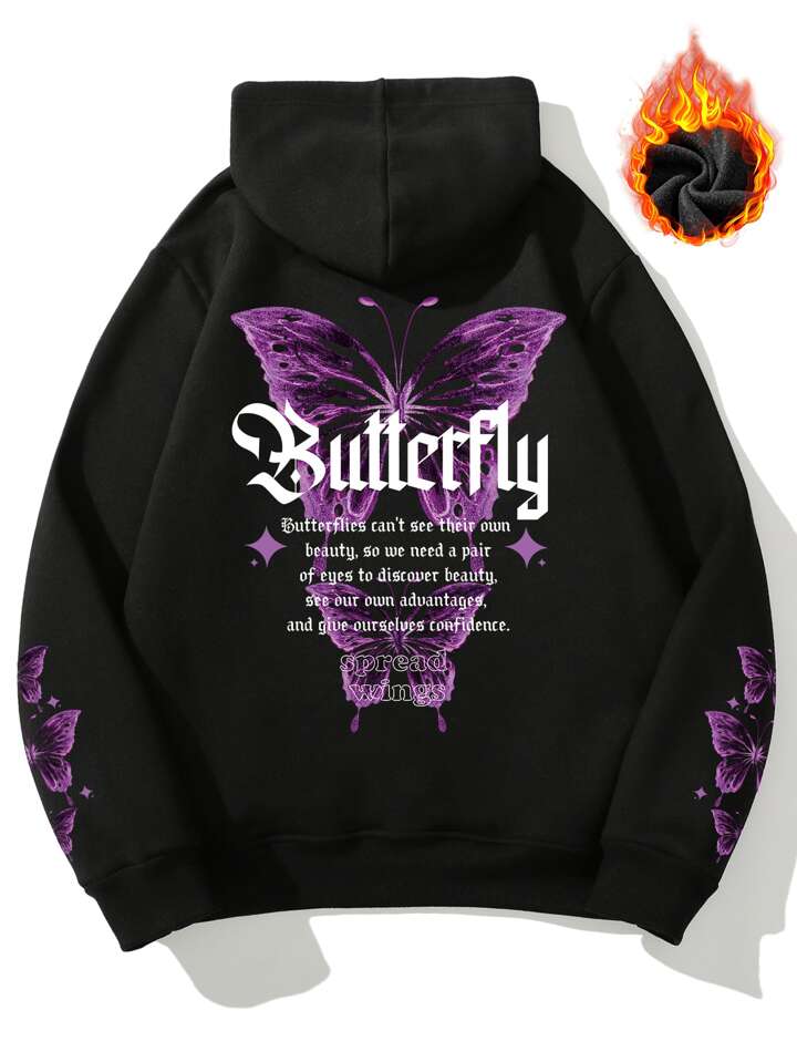 هودي حراري بجرافيك فراشة وشعار جيب الكنغر رباط للرجال