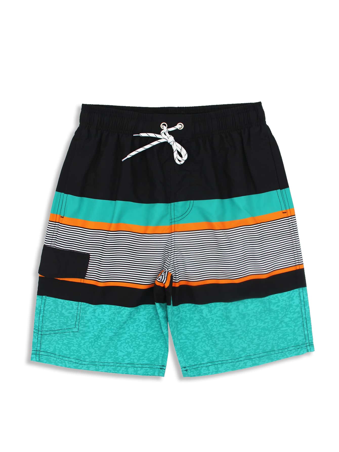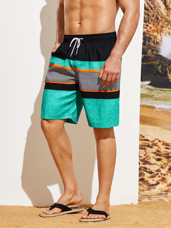 سروال قصير للسباحة مع تفاصيل الرباط والطباعة المخططة بلون مقسوم للرجال، شورتات عطلة الشاطئ