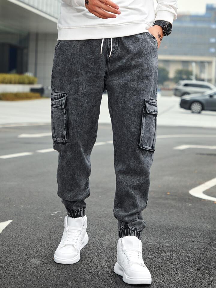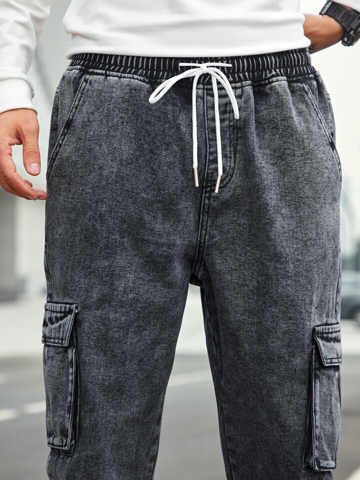 جينز رجالي واسع باللون الأزرق الغامق العادي، مصنوع من القطن، يحتوي على جيوب واسعة بسحاب، وخصر يربط برباط، مناسب للتمارين الرياضية والأوقات الخارجية