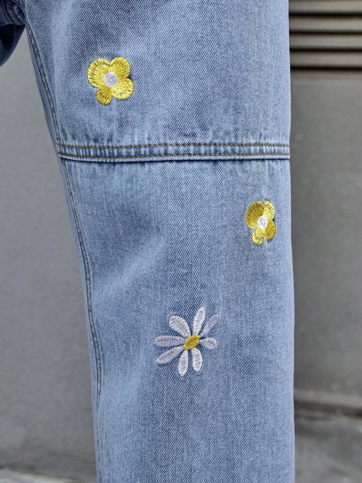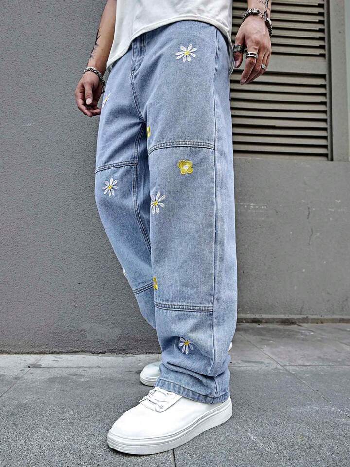 سراويل جينز رجالية قطنية بتطريز زهري ذات ساق مستقيمة