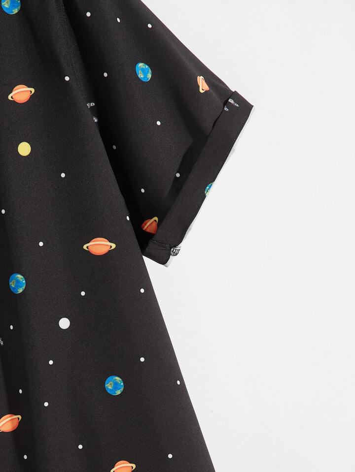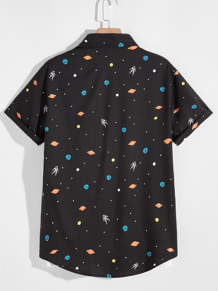 قميص رجالي بطبعة الكواكب والرائد الفضائي بدون تي شيرت ، بأكمام قصيرة ويغلق بأزرار ويأتي بياقة وتصميم جرافيك ملون