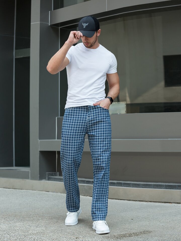 جينز بساق مستقيم طباعة نقش مسنن للرجال