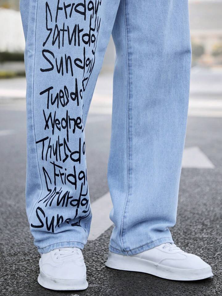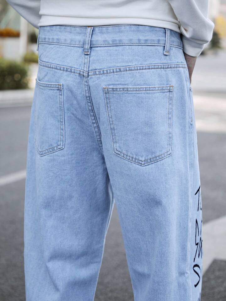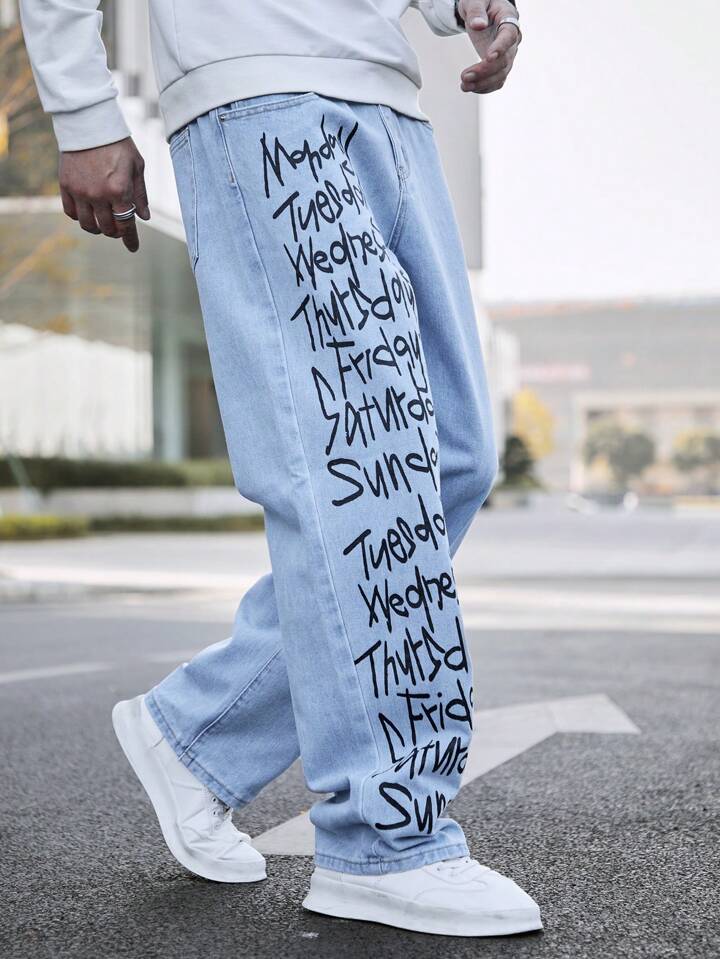 سراويل جينز بقصة مريحة مطبوع عليها شعار، سراويل جينز كارجو واسعة ذات لون أزرق فاتح، سراويل جينز طويلة مبيضة، هدايا للزوج أو الخطيب