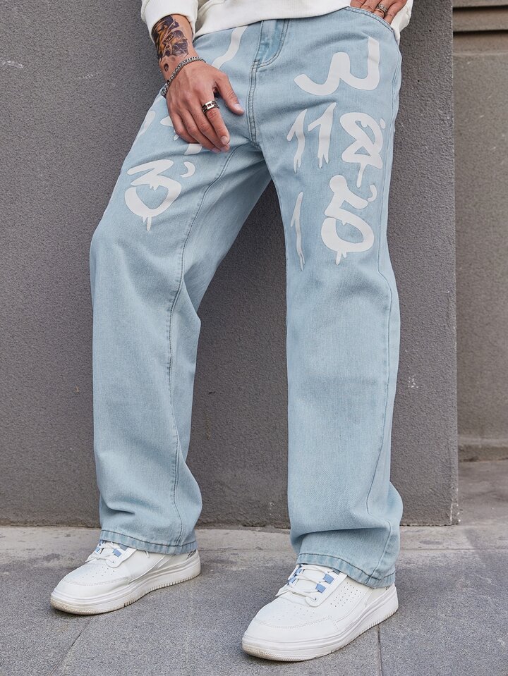 جينز الدنيم الأزرق المريح للرجال ذو الحروف المطبوعة والرسومات وقصة الساق العادية الطويلة مع التطريز وجينز السكيتر وطبعة جرافيتي ونمط خفيف عادي و Y2K