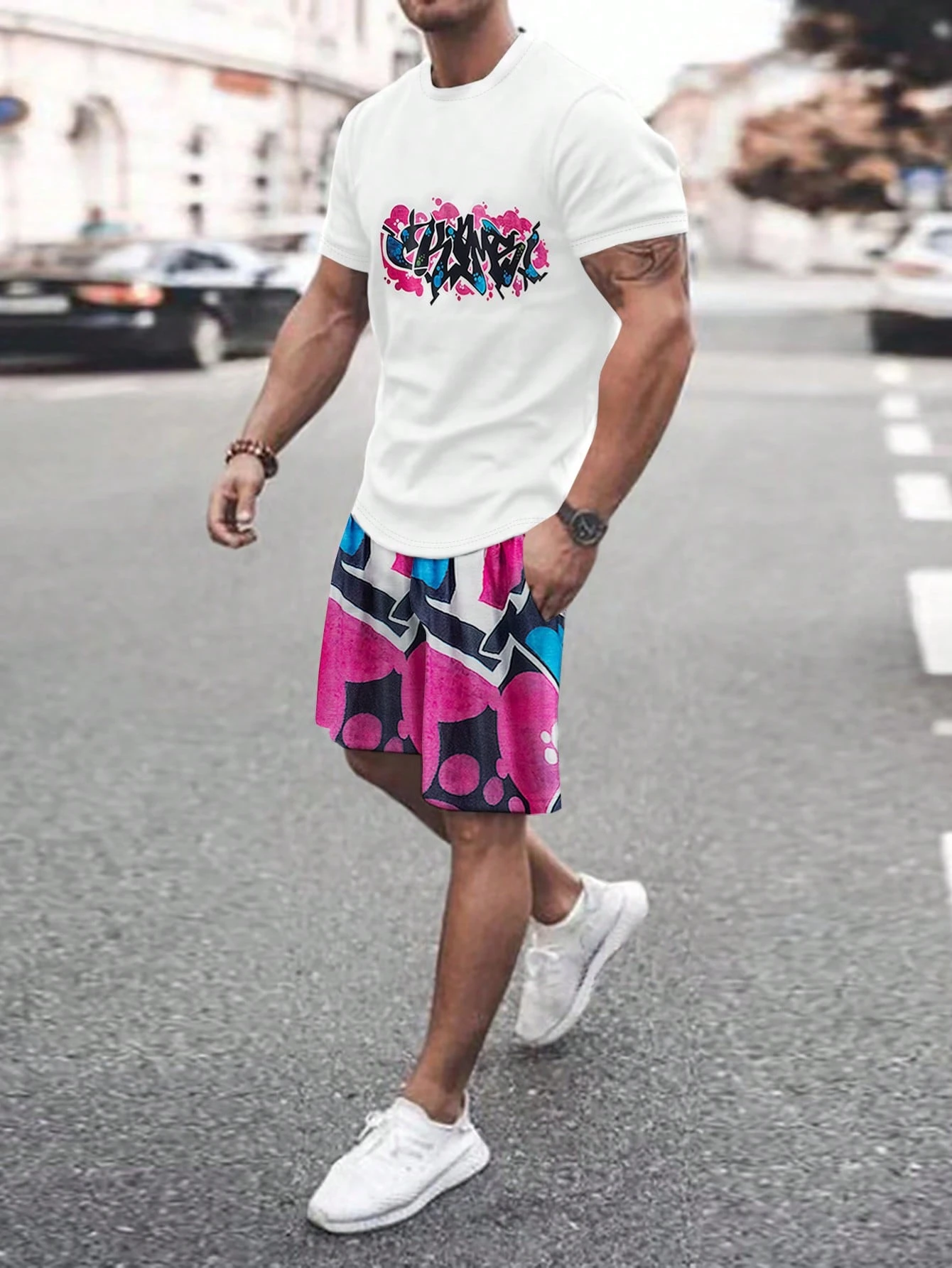 للرجال بطباعة أحرف تي شيرت و بطباعة غرافيتي رباط خصر بنطلون قصير