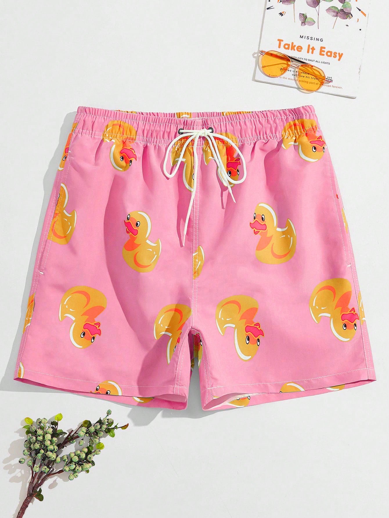سروال السباحة للرجال بطباعة بطة كرتونية عشوائية، هاواي