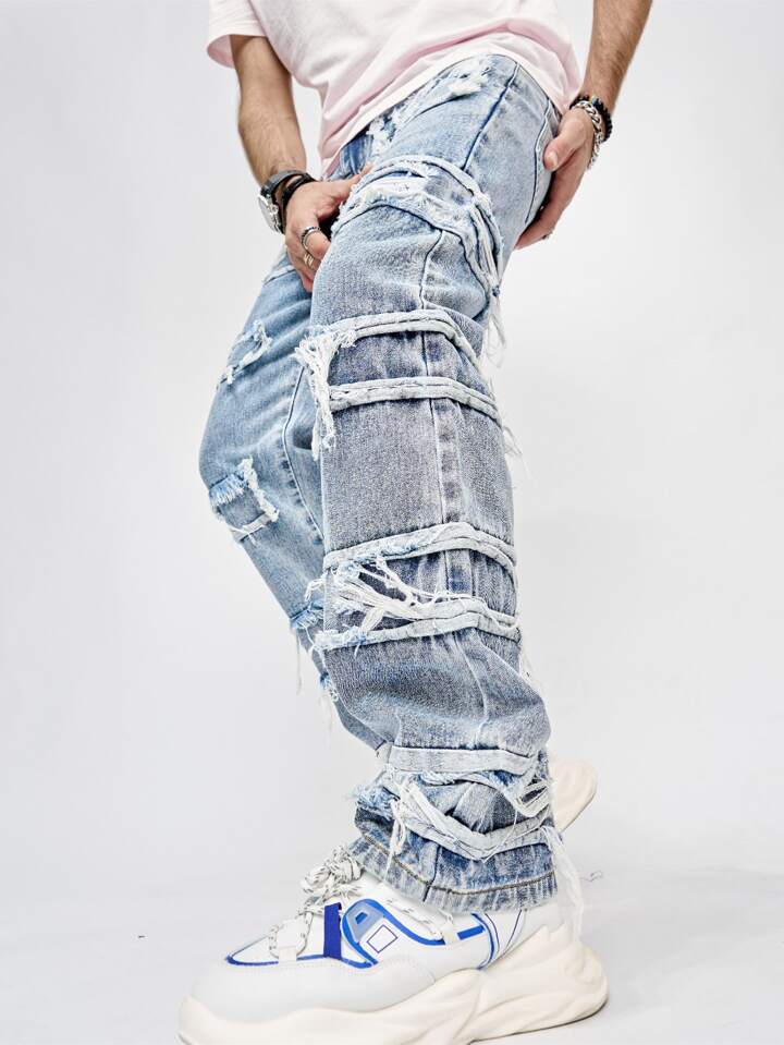 جينز بساق مستقيم قطن ممزق مهتري الحواف للرجال