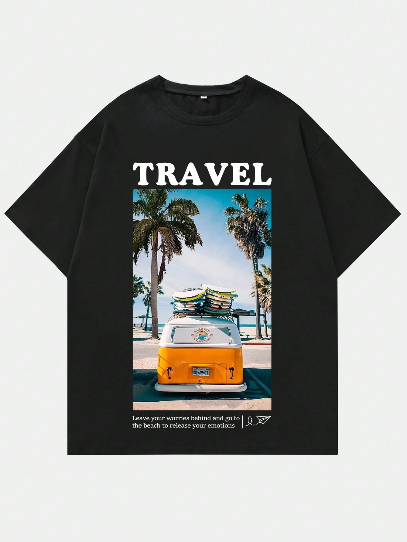 تي شيرت منخفض الاكتاف شعار و طباعة شجرة النخيل للشباب