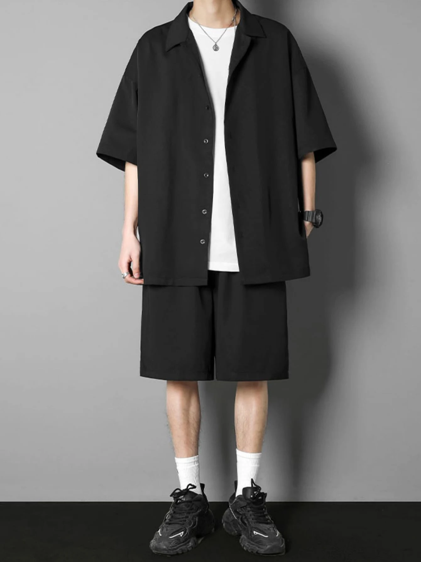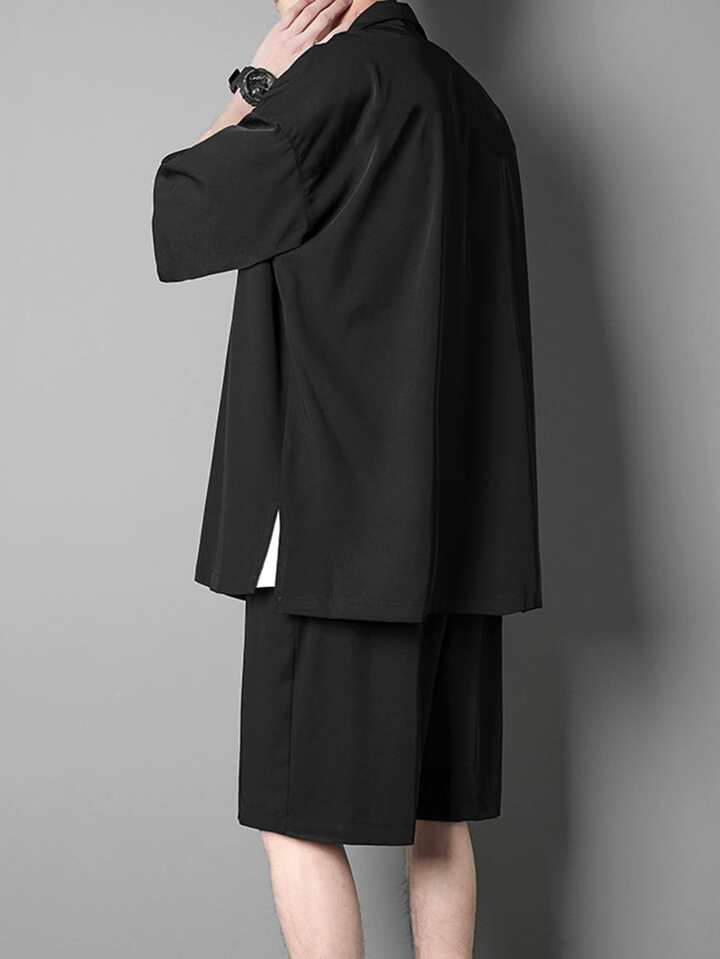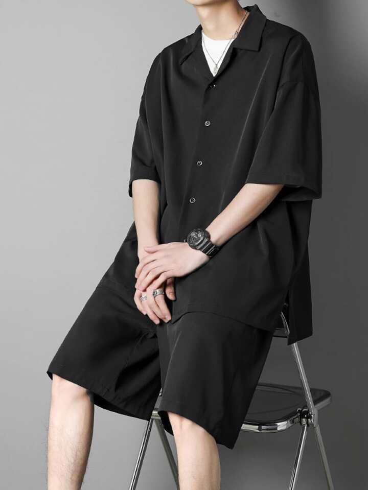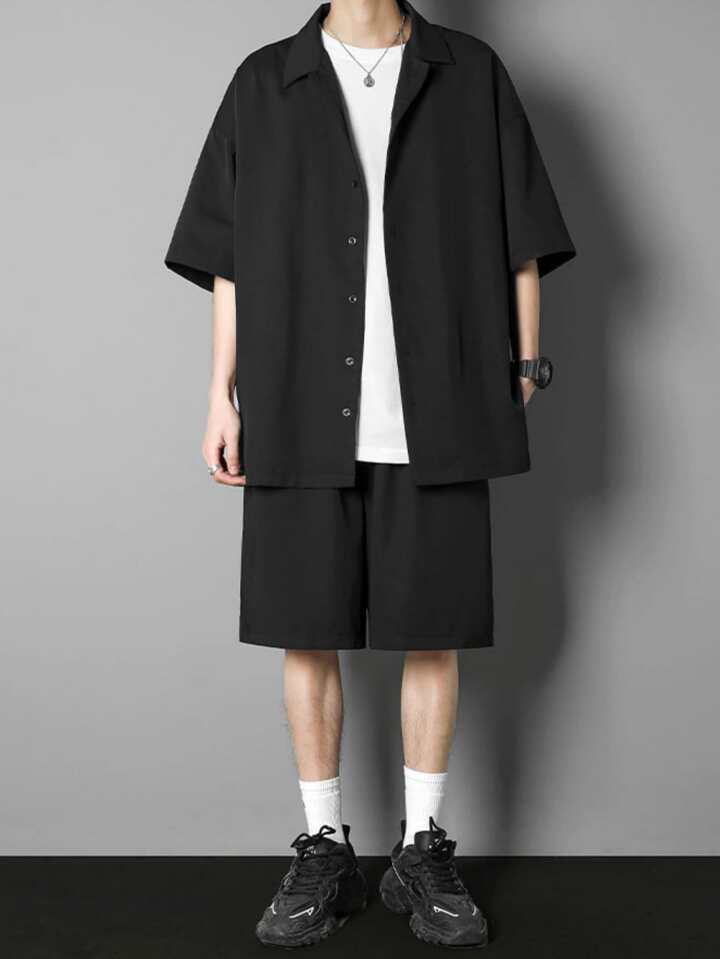 للرجال قميص موحدة اللون منخفض الاكتاف و بنطلون قصير بدون تي شيرت