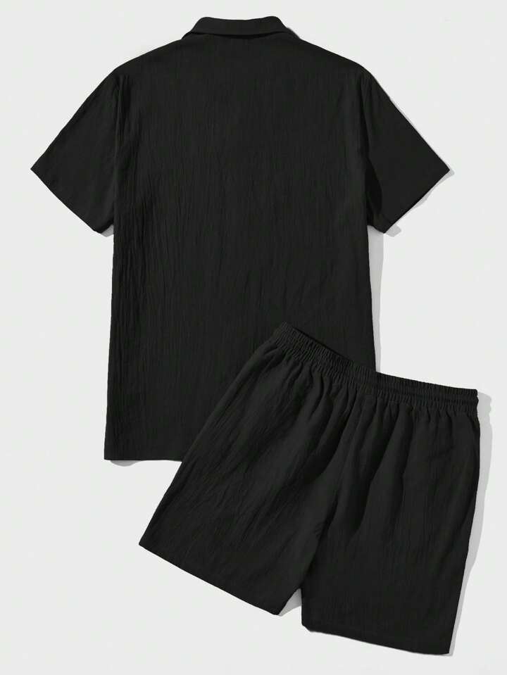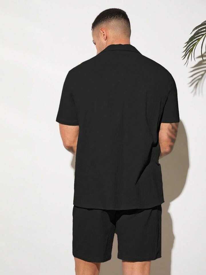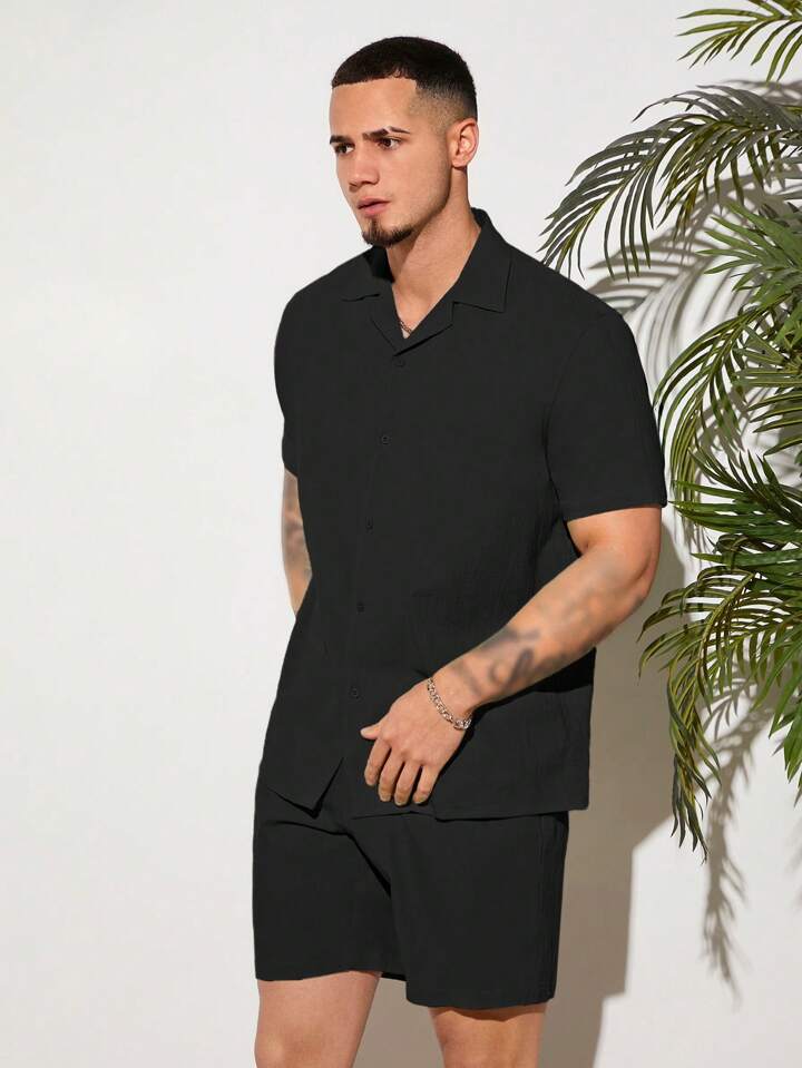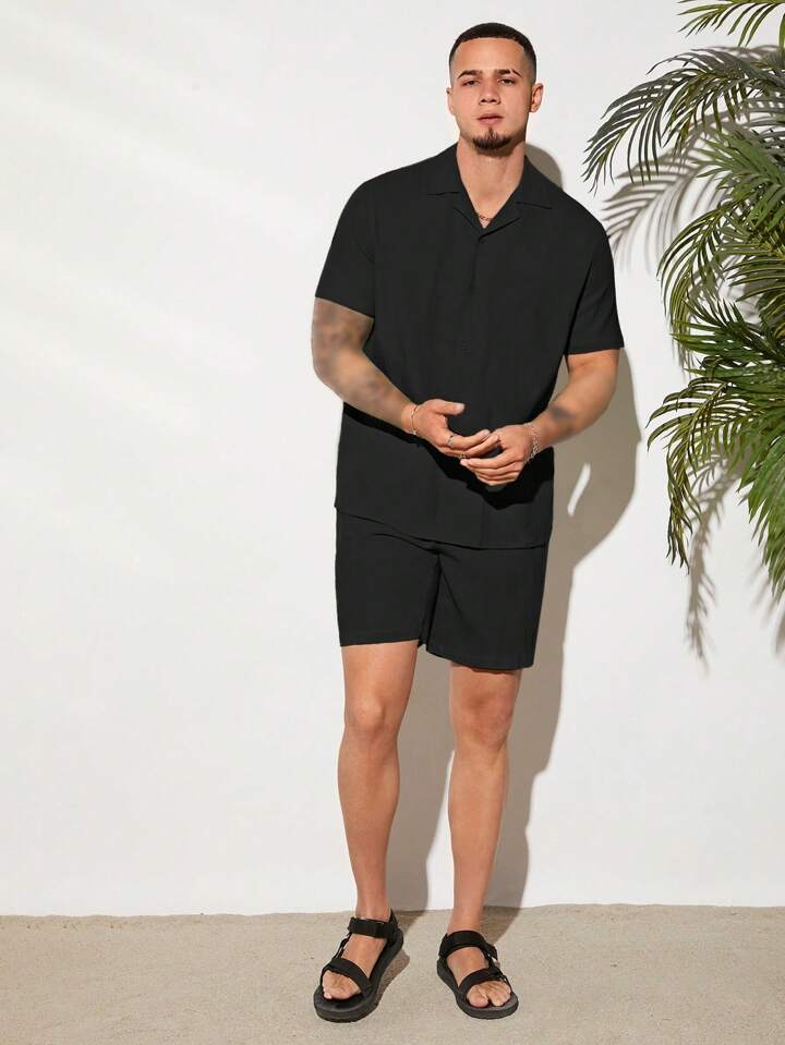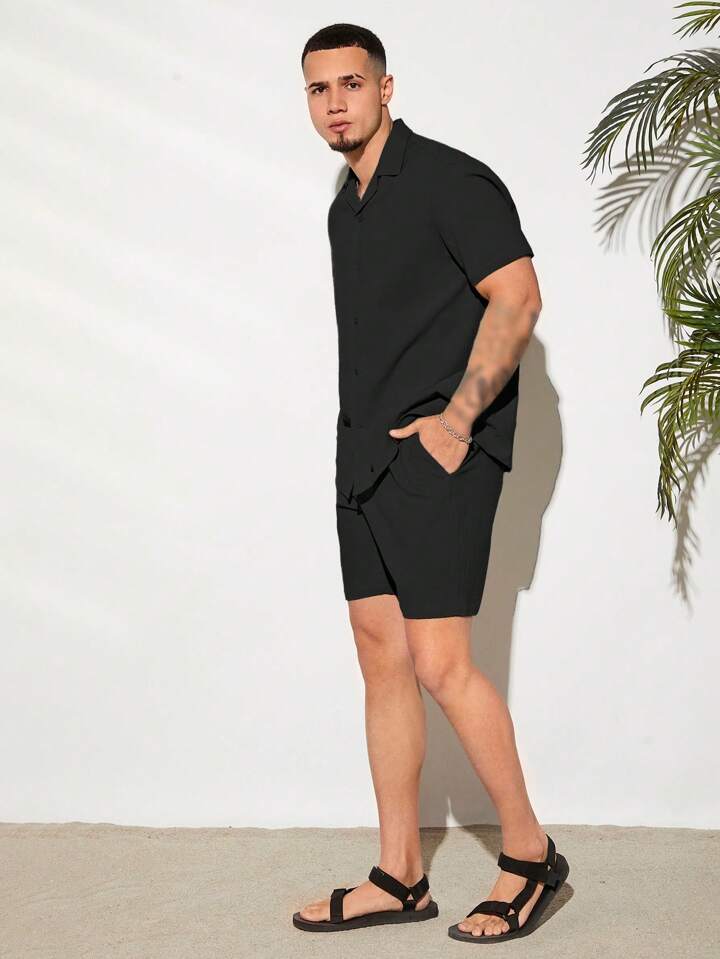 طقم قميص لون سادة بناطيل قصيرة بجيب مائل للرجال