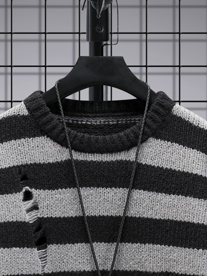 بلوفر رجالي بأكمام طويلة مزخرف بنمط مخطط ممزق، لون كتلة جرافيك للارتداء اليومي، مناسب للعطلات والأصدقاء، بلوفر محبوك مخطط، بلوفر محبوك مشوه، بلوفر رجالي مخطط، خريف وشتاء