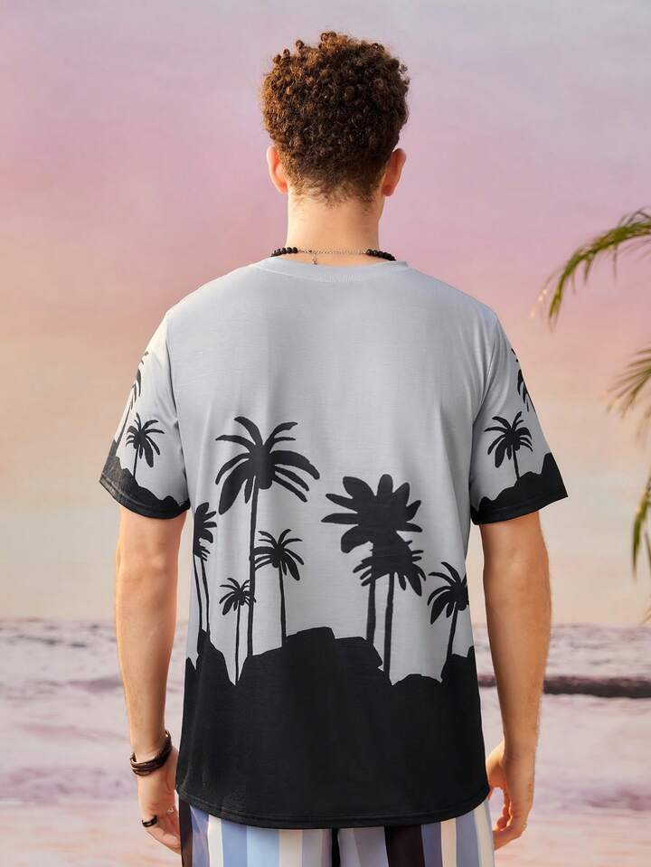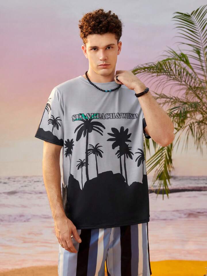 تي شيرت استوائي و بطباعة أحرف للشباب