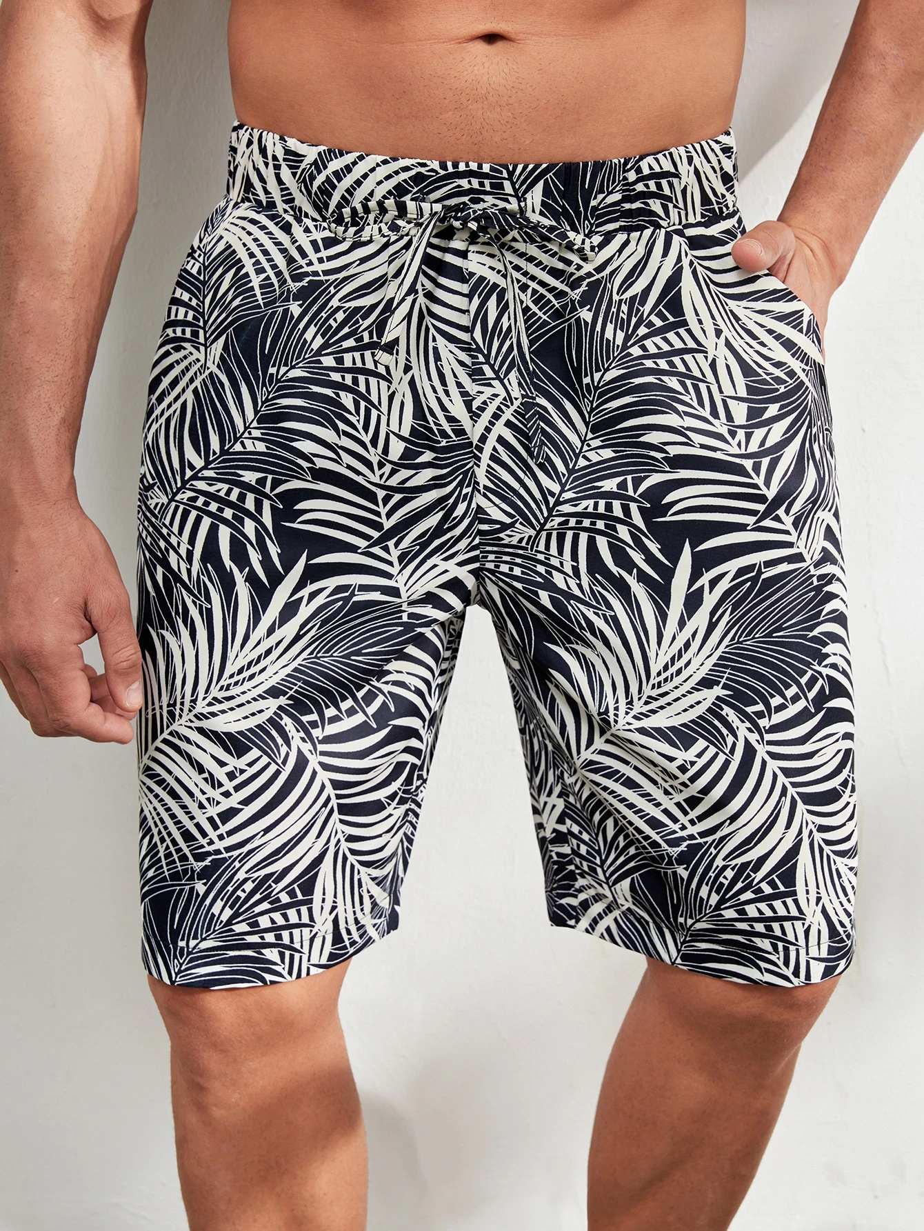 بنطلون قصير بطباعة استوائية رباط خصر للرجال