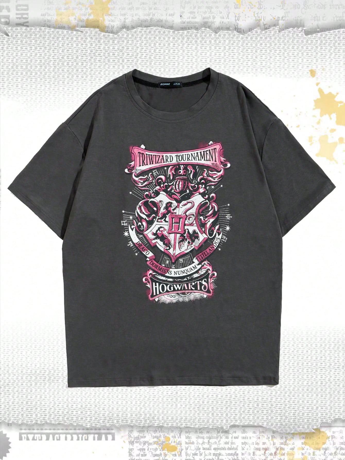 Harry Potter | ROMWE تي شيرت منخفض الاكتاف بطباعة أحرف للشباب