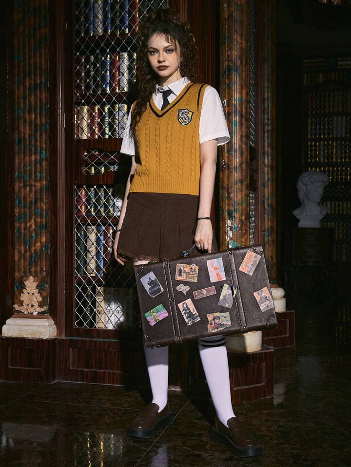 Harry Potter | ROMWE كنزة صدرية بخياطة حرف وشريط مخطط ومحبوك كابل بدون قميص، مدرسة