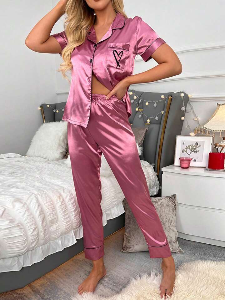 طقم بيجامة ساتان مزين بتطريز على شكل قلب