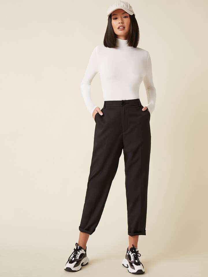 تيشيرت ضيق موحدة اللون بعنق عالي