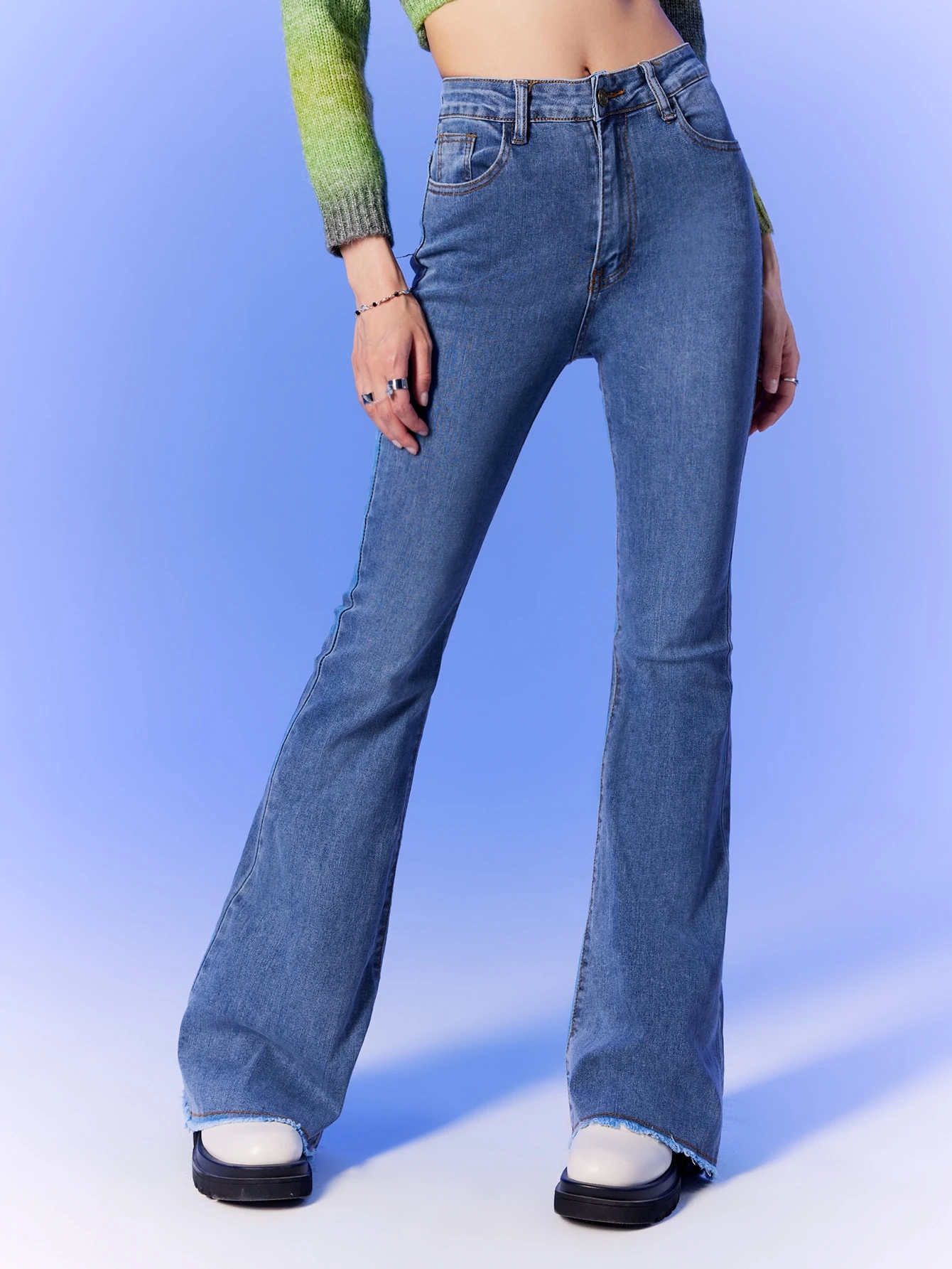 بنطلون جينز واسع من الاسفل بحافة خام وبخصر عالي