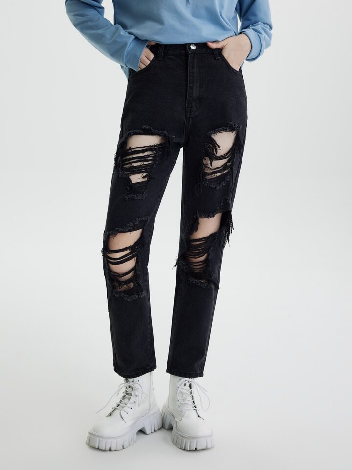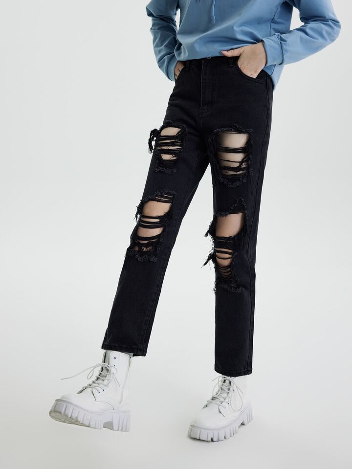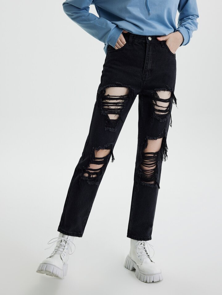 جينز نسائي الزر الجيب ممزق سستة الصاف