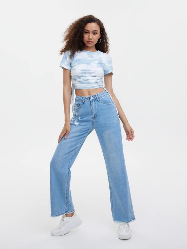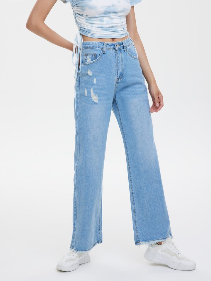 بنطلون جينز بساق مستقيم وممزق بخصر عالي