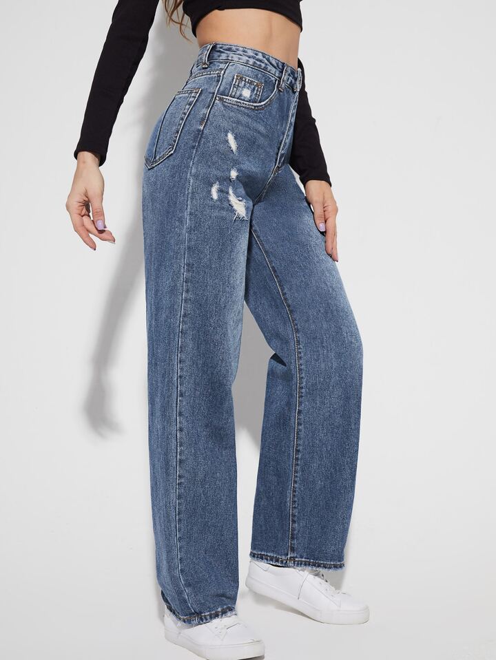 بنطلون جينز بساق مستقيم وممزق بخصر عالي