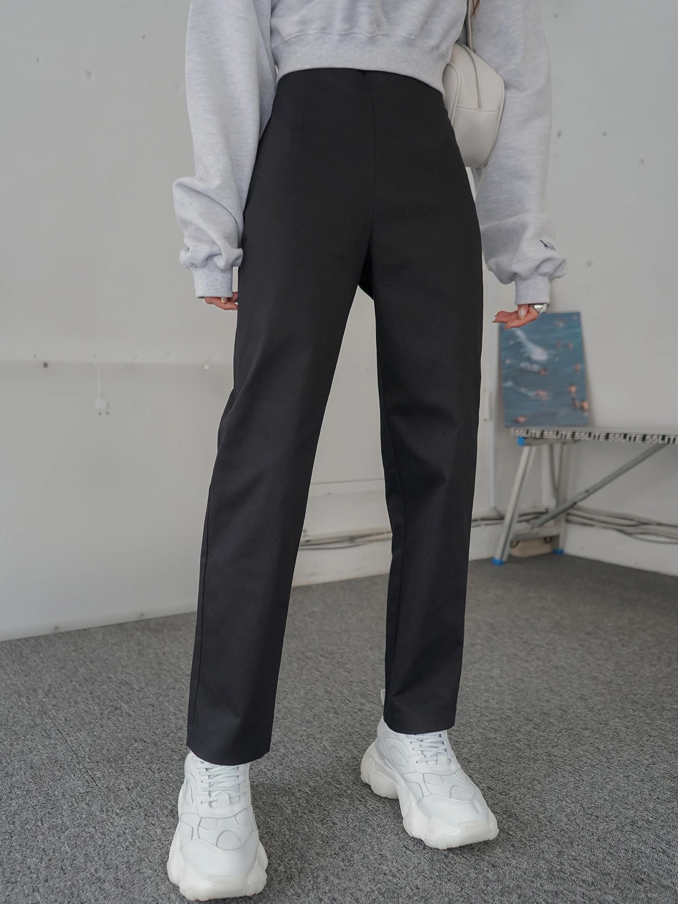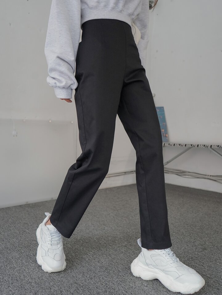 بنطلون بساق مستقيم بلون موحد بخصر عالي