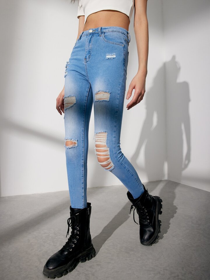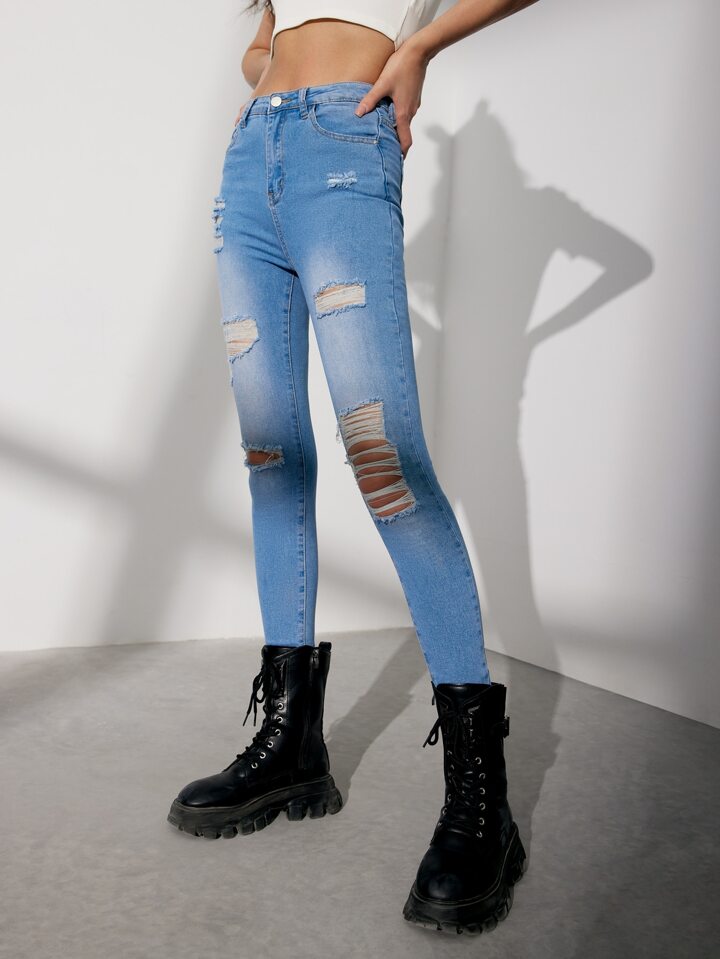 بنطلون جينز نحيل بحافة خام ممزق بخصر عالي