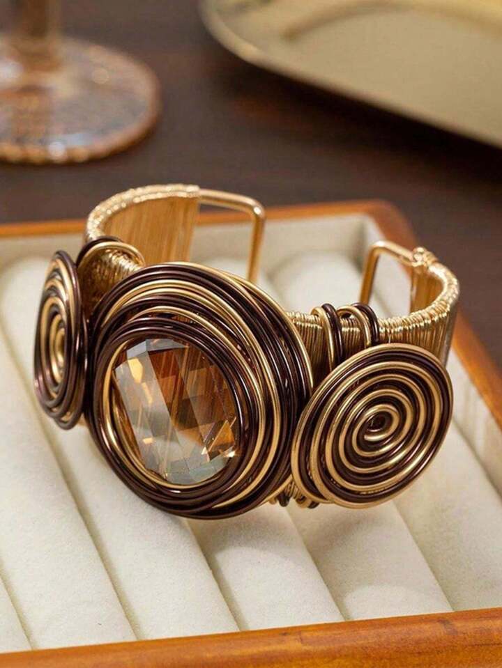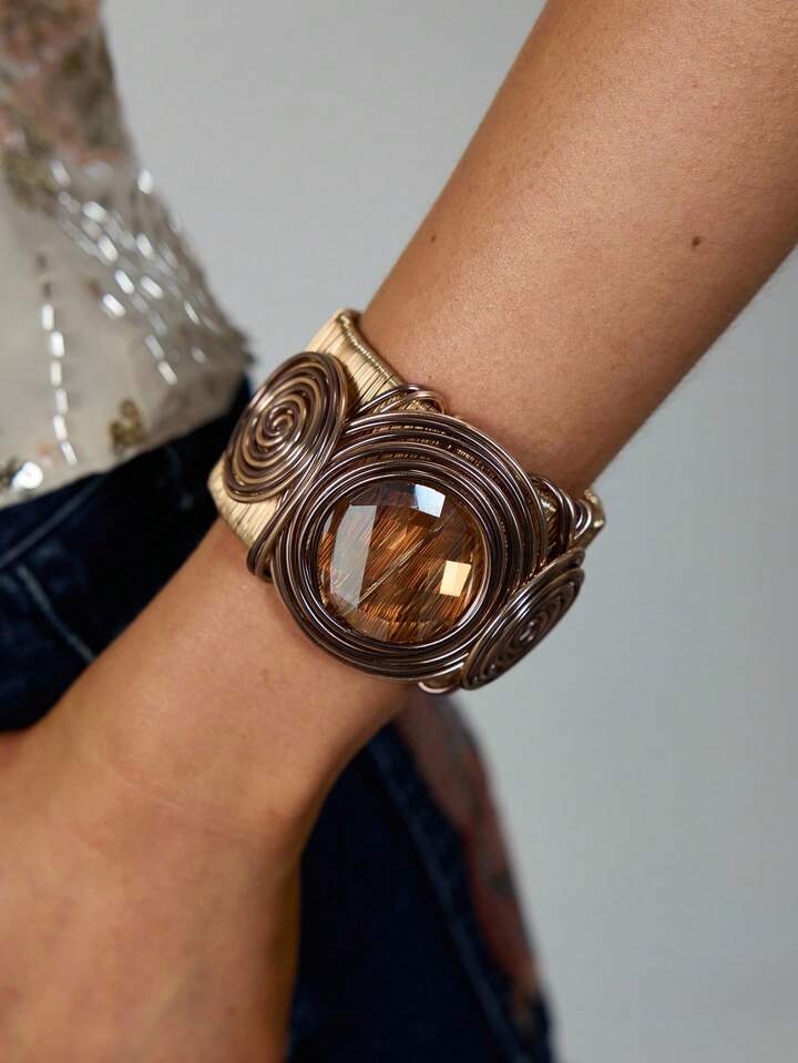 Hippie قطعة واحدة من الأساور المفتوحة المزينة بالسلك المعدني والبلورات البنية ذات الطراز الهندسي للأنماط الروك البانك، معدني متعدد اللفات بطراز عصري، سوار فريد ذو تصميم عالي المستوى وعصري مناسب للاستخدام المتعدد